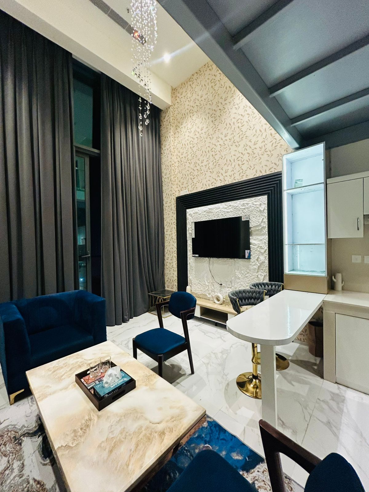 Welcome to our luxurious urban Studio, a sanctuary of style and sophistication in the vibrant heart of the Gurgaon. A standout feature of our loft is specialty Black color scheme, which adds a touch of elegance and drama to space, making your stay comfortable & stunning. As you step into our elegantly furnished Studio, you’ll be greeted by sight of our plush black recliners. These two luxurious recliners are the centerpiece, offering a perfect blend of contemporary design & exceptional comfort.