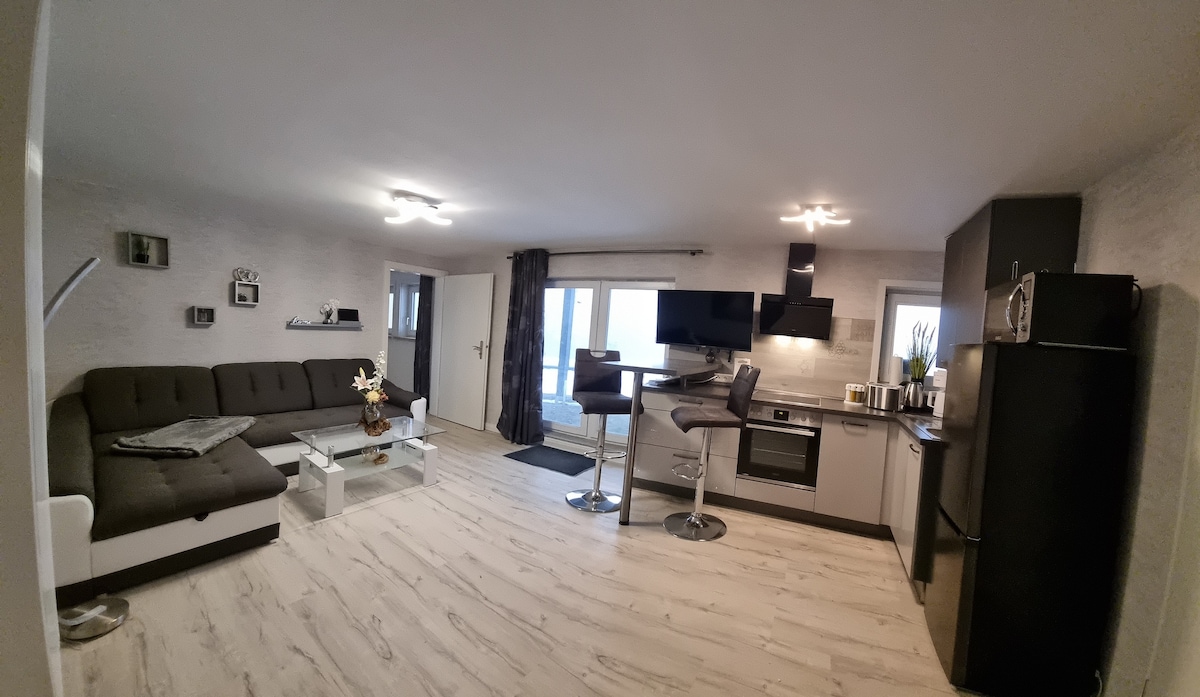 Unsere Wohnung 6 befindet sich im Souterrain mit Blick und Ausgang in den Garten. Mit 38m² besteht diese aus Schlafzimmer mit Doppelbett 180×200, Wohnzimmer mit offener Wohnküche und Duschbad. Durch die Nutzung der ausziehbaren Schlafcouch ist eine Belegung mit bis zu 4 Personen möglich. Für all unsere Gäste ist die Nutzung unserer kl. Wellness-Bereiche im Souterrain beider Häuser mit Whirlpool,Infarotkabine, Sportgeräten, Dusche und Sauna nach Verfügbarkeit inklusive.