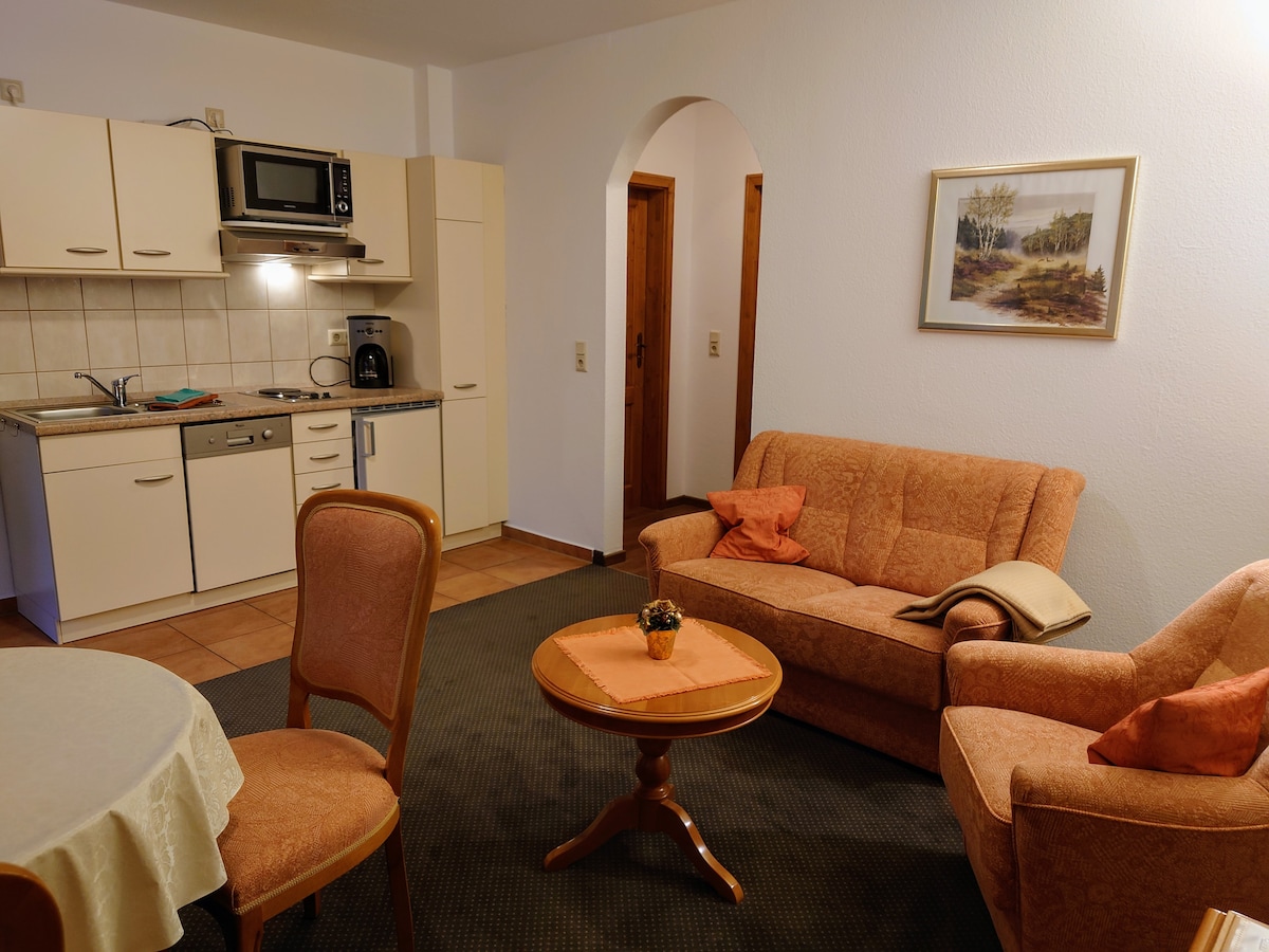 Liebevoll eingerichtetes, sehr gut ausgestattetes 1-Zimmer Apartment (35 qm) für 2 Personen (ggf. mit Baby/Kleinkind, Hund) mit voll ausgestatteter EBK mit Geschirrspüler, Ceranfeld (2 Platten), Duschbad, WC, Boxspringbett (1,60 x 2,00 m), gemütlichem Sofa, TV, Verdunkelungsvorhängen, überdachtem Balkon mit Morgensonne, kostenlosen Parkflächen, zentrumsnah, in einer sehr gepflegten Anlage. Die Anlage bietet: Lift, Sauna, Gym, Tischtennis, Kicker, Waschmaschine, Trockner, Skikeller