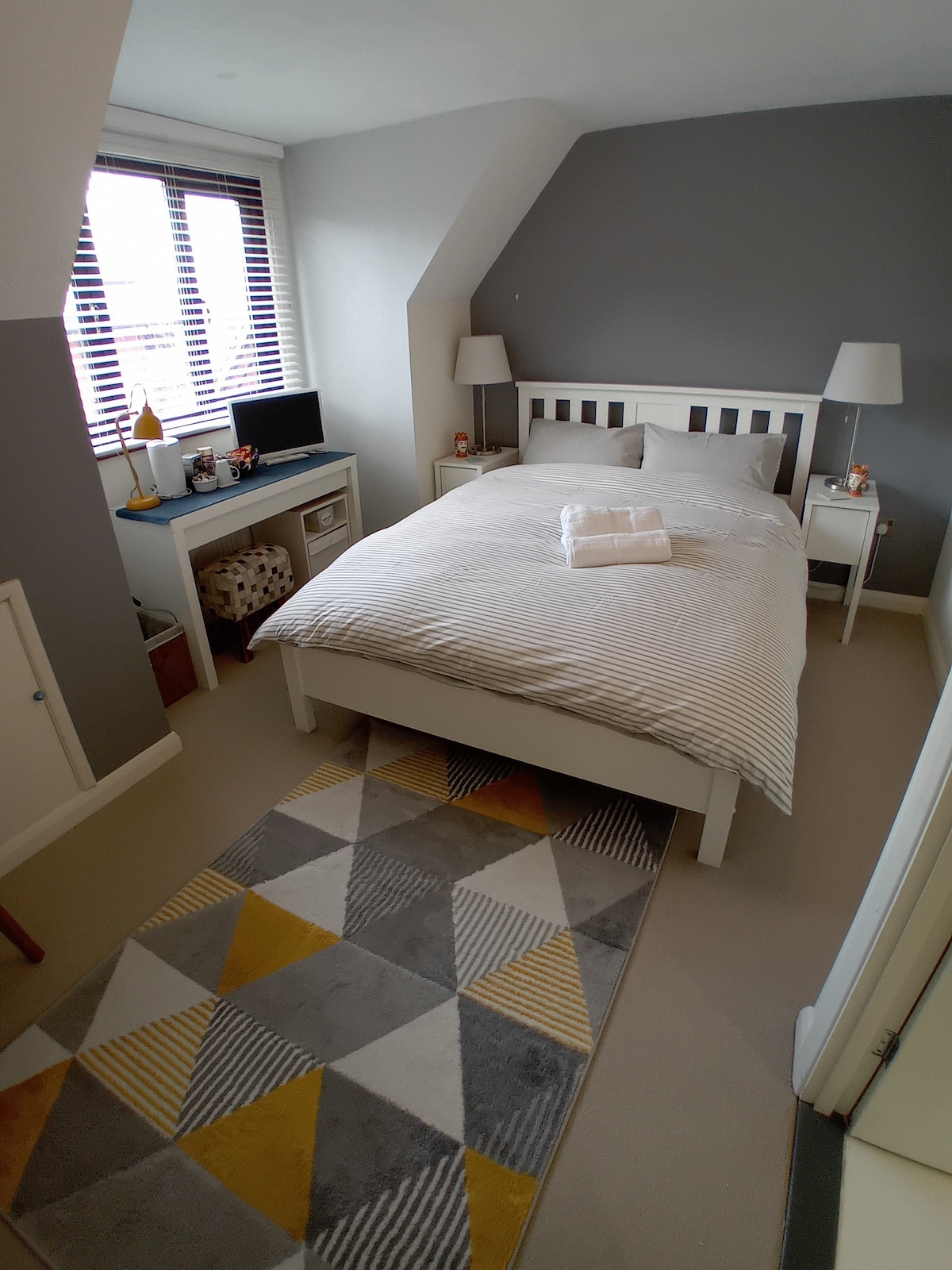 Self contained studio room with loft double bed, kitchen (including oven, hob, microwave and fridge) and shower room. Quiet location, 5 minutes walk to station, 5 minute walk to central Godalming. If required, the room can be configured with a table rather than the standard extended seating, see photos. Please message after booking if the table configuration is required.