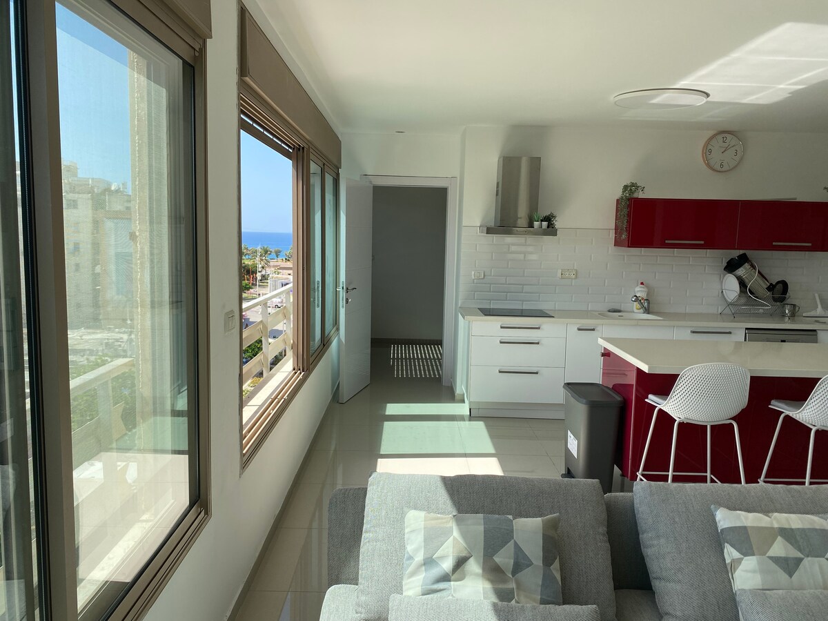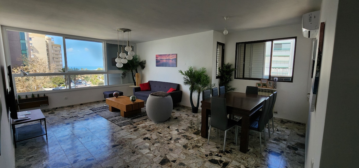Enjoy panoramic sea views, refreshing sea breeze and the serene sound of waves, from every corner of the 3-rooms apartment. - 2 Bedrooms, with European King and Double bed. Both have their private bathrooms, ensuring utmost comfort and privacy. - Living Room & fully equipped Kitchen & Dining Area - 1-minute walk to the beach, cafes, restaurants, shops on Nitza Avenue sea promenade. The seasonal beach, with beach services and rescue, awaits on downhill. - City center within walking distance.