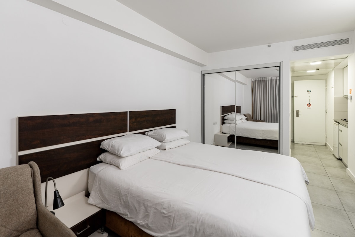 beautiful 2 room apartments fully furnished and modern, perfect for 2 people in a new building with 24/7 security, with swimming pool and a gym. 5 minutes walk from the southern beach of Netanya . no smoking and no pets
