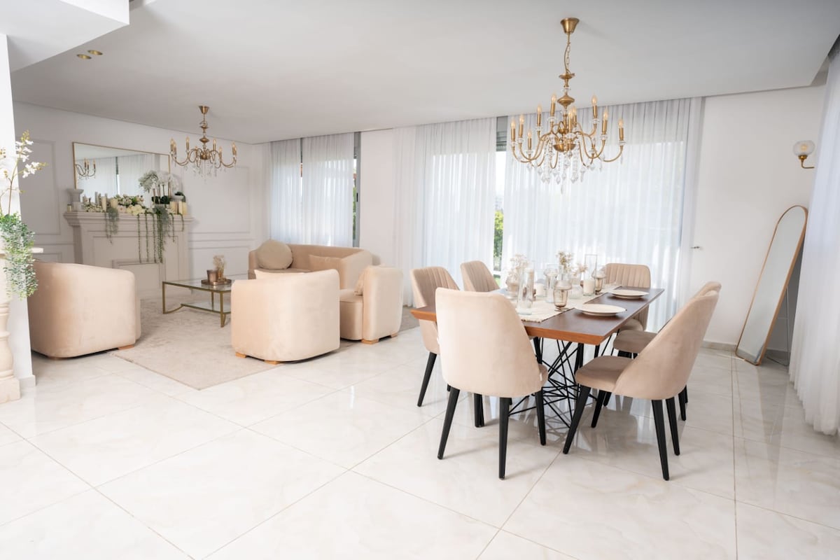 Stay in my luxurious 3-bedroom home in a quiet village in central Israel, featuring a 6-meter-high ceiling and a unique blend of upscale pop art and vintage decor. Enjoy sunrise views from the master bedroom and sunset from the panoramic terrace with a jacuzzi and outdoor shower. Includes a fully equipped kitchen, kids' room with bunk beds, safe room (mamad) with work and play areas, fast Wi-Fi, Netflix, washer, and dryer. Perfect for does who seeking comfort and style!