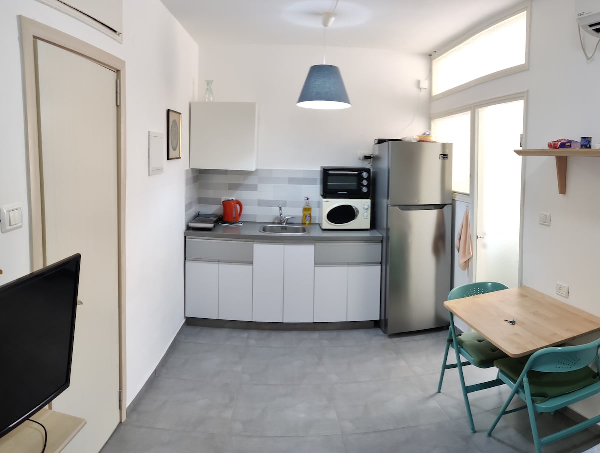 A guest unit which includes a bedroom (12m2), kitchenette, and a separate private shower-room (2.5m2). It is small but fully renovated, clean, and functional. Suitable for singles or couples looking to save on lodging cost by cozying in. Located in beautiful Ramat Poleg. 7 minutes walk to the beach. 15 minutes walk to a major shopping mall. Public transportation is just around the corner