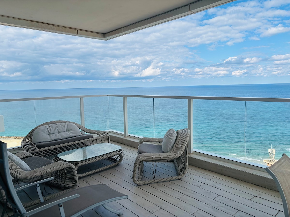 Stunning large and spacious penthouse apartment with western front overlooking the sea and the preserve. Fully equipped and furnished. Kosher Kitchen included. A wide and large living room. 2 very large patios with frontal Seaview, one facing west including a barbecue. A second balcony with an exit from a pampering and large master bedroom facing south-east 70 square meters each. Apartment faces southwest guard 24/7. Great energy!