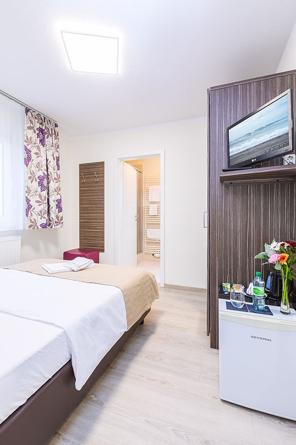 Unsere moderne, 45 qm große Unterkunft bietet Platz für 2 Personen. Im Erdgeschoss gelegen, umfasst sie ein Wohn-/Schlafzimmer mit Doppelbett, Schlafcouch und Internet-TV. Die Wohnküche ist komplett ausgestattet und verfügt über Internet-TV. Das Bad hat eine begehbare Dusche und WC. Rauchen und Haustiere sind nicht erlaubt. Es gibt eine Sitzgelegenheit, Parkplatz und Fahrradabstellmöglichkeiten. WLAN, Bettwäsche und Handtücher sind vorhanden.