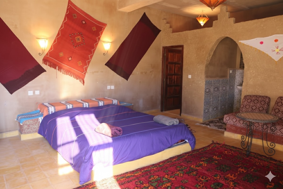Plongez dans la paix d'une maison spacieuse. Loin du tourisme de masse, cet espace de sérénité vous offre, depuis sa terrasse, le spectacle inoubliable du lever du soleil sur les majestueuses dunes ! Vivez une expérience unique : en autonomie ou avec Hamid, votre hôte expert en bio-tourisme. Organisation des voyages immersifs sur mesure et une immersion complète dans la culture berbère et ses paysages (oasis, villages nomades). Idéal pour voyageurs en quête de paix et de traditions locales.
