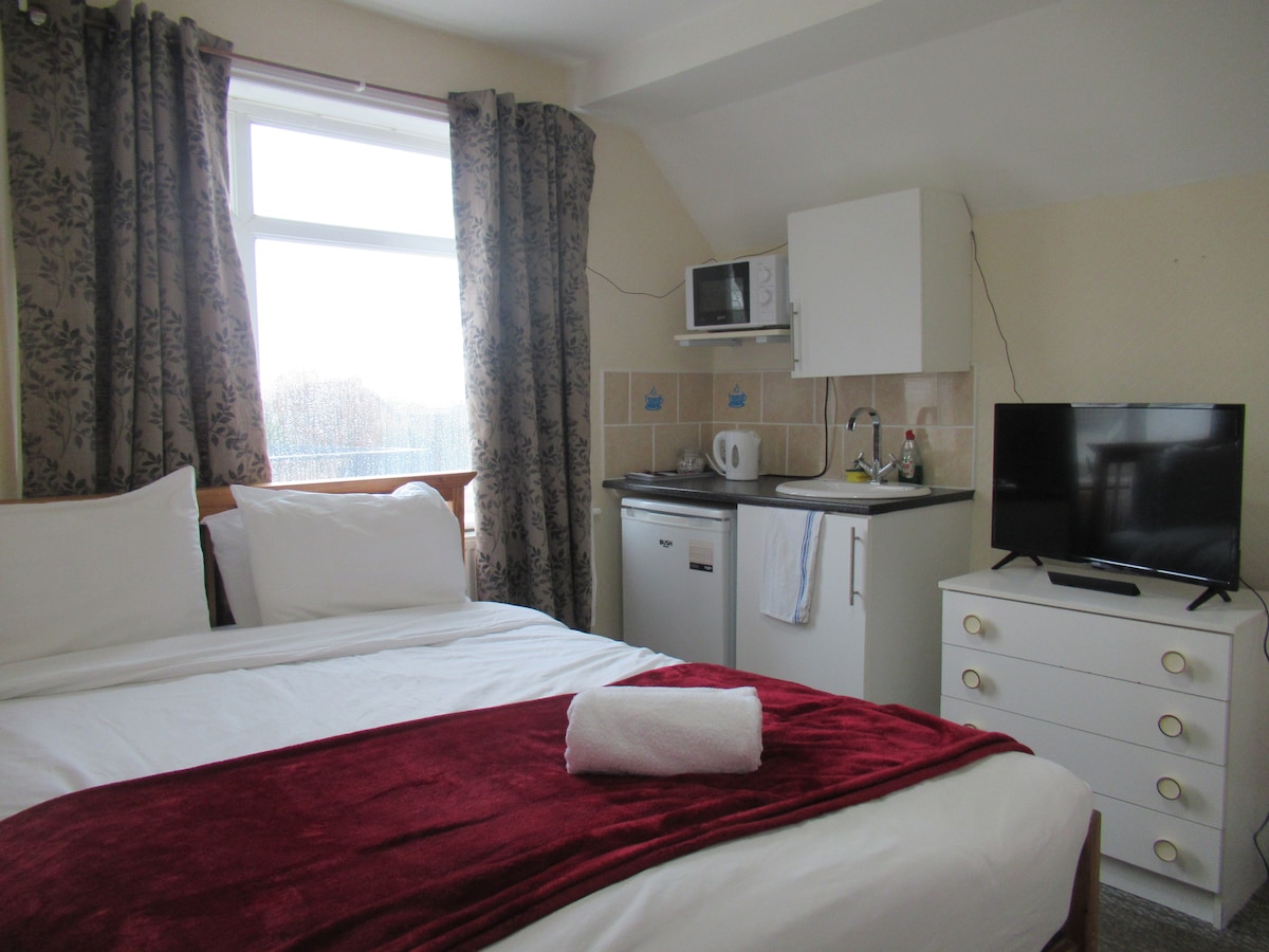 Double room with a private bathroom & kitchenette. The room is equipped with a fridge, a kettle, a microwave and a TV. Shared facilities: 3 x 50 inch TVs in the Kitchens & Living room. Breakfast not included in price but can be purchased separately in our sister hotel next door.
