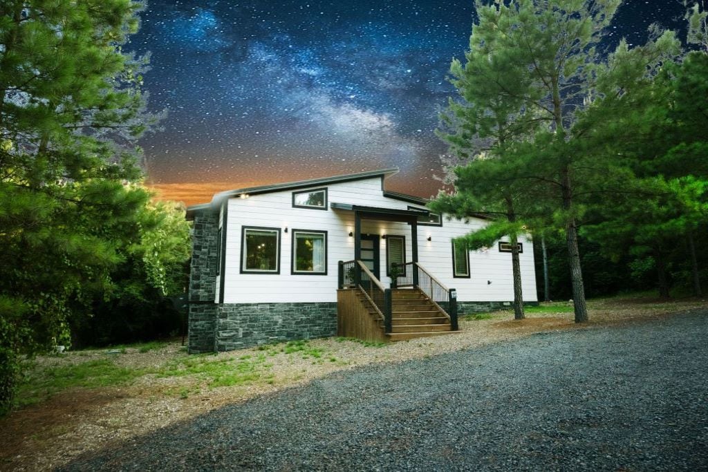 Introducing The Onyx Escape in Broken Bow Oklahoma! A true Honeymoon cabin experience. Discover the unparalleled serenity, nestled amidst the picturesque Ouachita National Forest. This spacious 1100 square ft. cabin boasts contemporary design and luxurious amenities to ensure your utmost relaxation and rejuvenation. The cabin showcases a vast outdoor living space surrounded by towering pine trees. Soak in the hot tub or cozy up by the fire while taking in the nature that surrounds you.