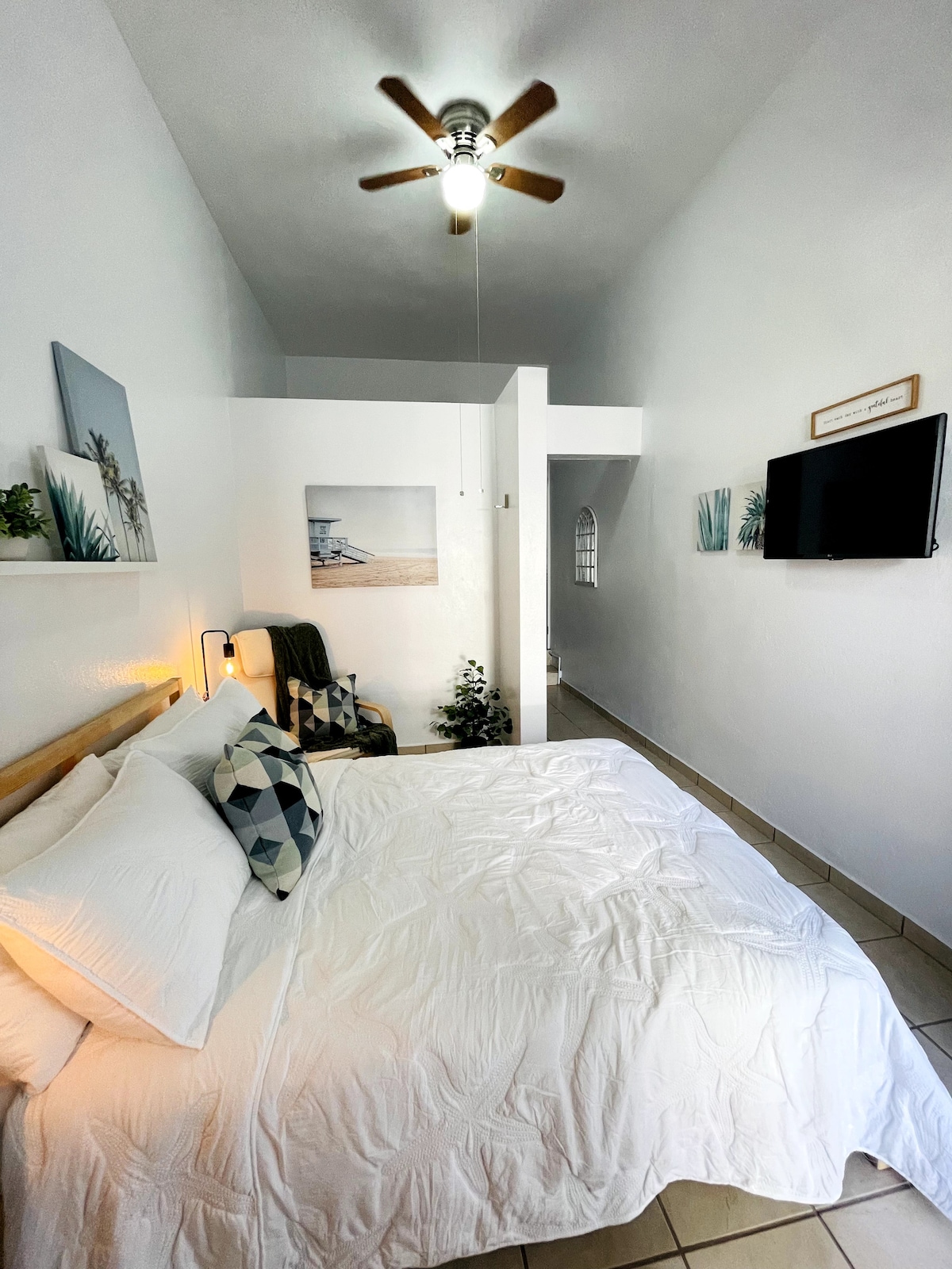 Power Generator/ cistern. Steps from the beach yet away from crowds. Private entrance, art studio vibe. 4x6ft work table. No TV, calming atmosphere specially curated to foster relaxation. Natural light and large windows, creating an invigorating environment. The apartment has a unique history as the owner's personal sewing studio, adding a touch of artisanal spirit to the space. When not used for artistic pursuits, it becomes a welcoming retreat for travelers seeking solace and inspiration.