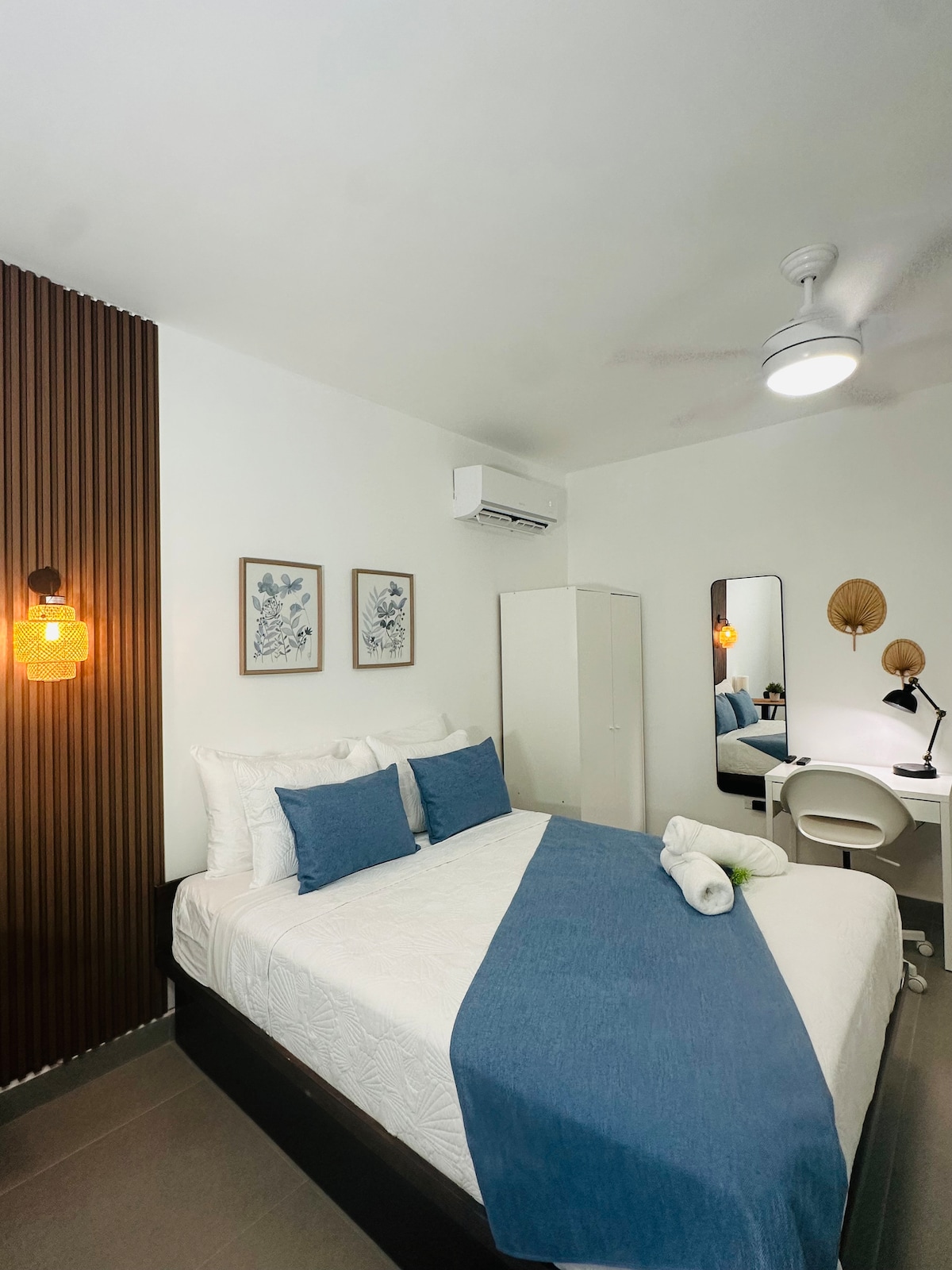 New apartment, steps from the Centro Médico, supermarket, bakery (24/7) and shops. 15 minutes from the beach and 7 minutes from Plaza las America in car. Fully equipped kitchen, private bathroom,outdoor area, parking, air conditioning, laundry, king bed, free wifi and Netflix. Central area and completely renovated.