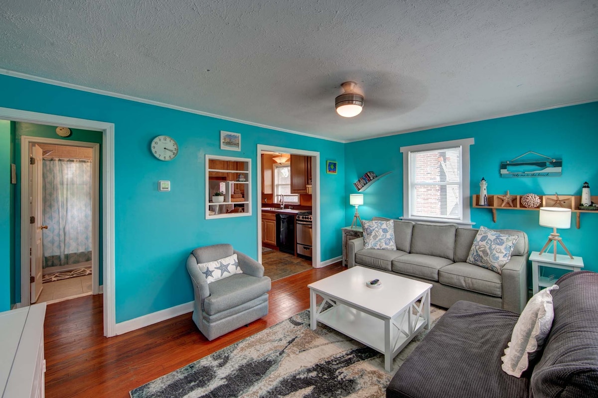 The two bedroom apartment includes a 55 inch flat screen, dish washer, microwave. Colorful, comfortable and convenient. This is the perfect getaway for couples, individuals, and children! Drop your kayak into the sound across the street at the Buxton Harbor. Short drive to Teaches Lair and Oden's Dock for charters and the free Ocracoke Ferry. This space is close to everything Hatteras!