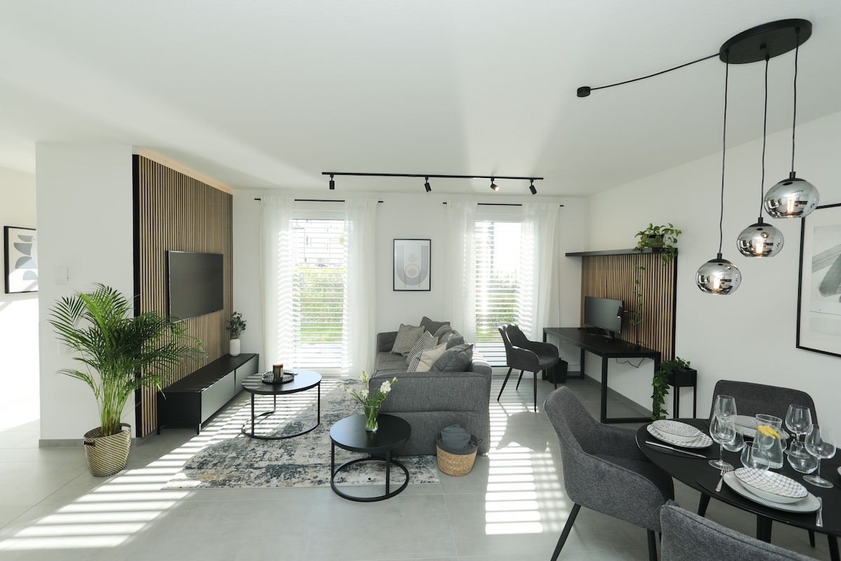 Panoramic 60 m² apartment – for up to 4 guests • King-size bed, sofa bed, folding bed (on request), baby crib • Fully equipped kitchen: stove, oven, kettle, coffee machine, dishwasher, fridge, TV • High-quality linens, towels, coffee & tea • Large terrace with sun lounger, nature view Great location: • 5 min by car / 30 min walk to Idstein center • Hiking trails start at the door • 20 min to Frankfurt Airport & Wiesbaden • 2 km to autobahn • Nearby playground & top grill restaurant