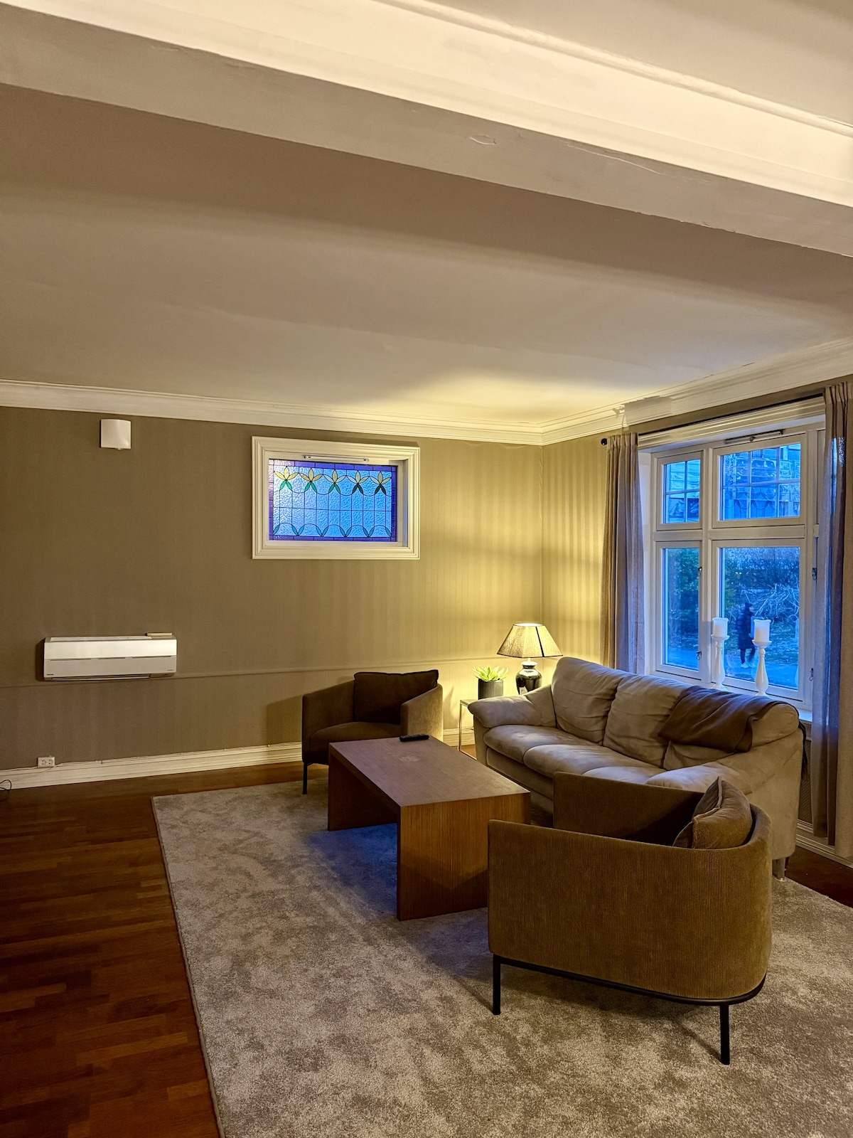 Leiligheten er i 1 etasje med tilgang til en liten terasse fra kjøkkenet. Stor og romslig stue og kjøkken. Kjøkkenet har en sofa gruppe og kjøkkenet brukes som samlingspunkt i hverdagen, når vi ikke har besøk. Vi bor selv i 2 etasje og har en spansk vannhund, så et bjeff og to vil forekomme😊. Mulighet for lengre leieperiode- send meg gjerne en melding, så ser vi hva vi får til :-) Hund tillat- men ikke katt.
