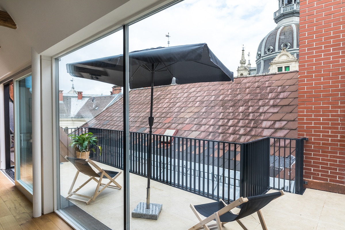 This Penthouse could NOT be more central! The apartment has one bedroom, one sofa bed and a large living room/kitchen, which offer a truly luxurious experience. It has a fully equipped kitchen and a direct access to a beautiful terrace. The modern and tastefully furnished living room invites you to sit back, relax and let the time go by. In addition, the apartment has a flat screen TV, high-speed internet and air conditioning. Enjoy a fantastic experience in Graz at this centrally-located place.