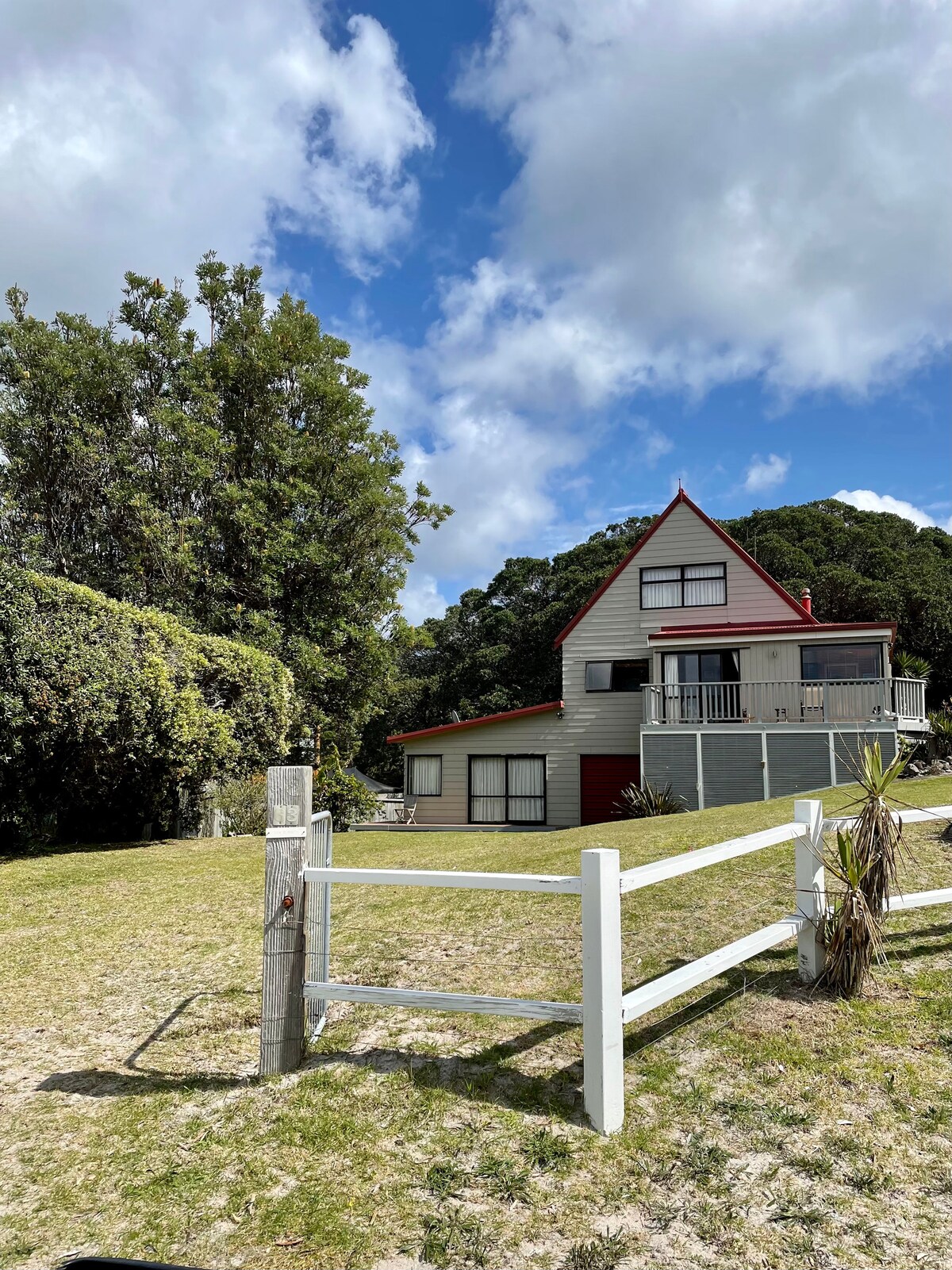 A home away from home 5 bedroom Bach, includes 4 bedrooms with king mattresses & a bunk room with 4 king single mattresses & 2 single trundler beds. This Bach is designed to relax and unwind-perfect for a large family or two families to enjoy a break away. Lovely indoor/outdoor flow onto sun drenched decking. Lazy 300m walk to amazing white sandy surf beach/kids playground. smart TV (Netflix etc) , EV Charging (15a/3kw), Wifi. A/C in main living area. Nespresso coffee machine (BYO "pods").