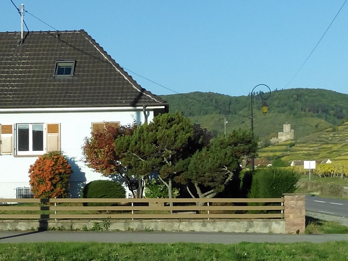 Our detached holiday home is located 1 km from the historic center of Kaysersberg, among vineyards and on the Alsace wine route. The land around the house is fenced and has a south-facing terrace, overlooking the vineyards. The renovated house offers spacious areas for a group of 12 people. 4 star rating. 4 bedrooms, 1 dormitory, 2 bathrooms, 4 toilets, 8 single beds (90x200), 2 double beds (160x200).