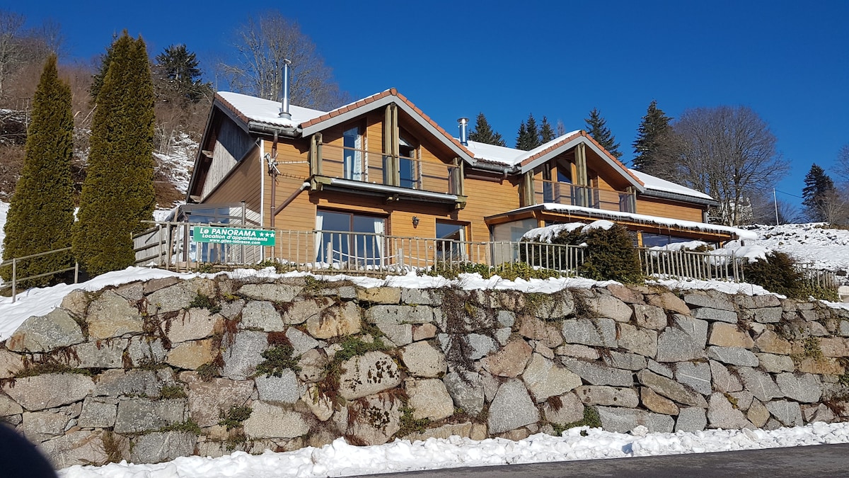 Very high standard chalet, sauna, jacuzzi, located 5 minutes from the La Bresse Hohneck ski resort. A chalet with a south-facing location and panoramic view of the Vosges mountains. The chalet offers high-end services for 13 people. Warm and comfortable atmosphere. The equipment is complete: flat screen television in 5 bedrooms and the living room; WI-FI, baby accessories... Garage for bicycles, motorcycles and skis, private parking. Bed and bathroom linen provided.