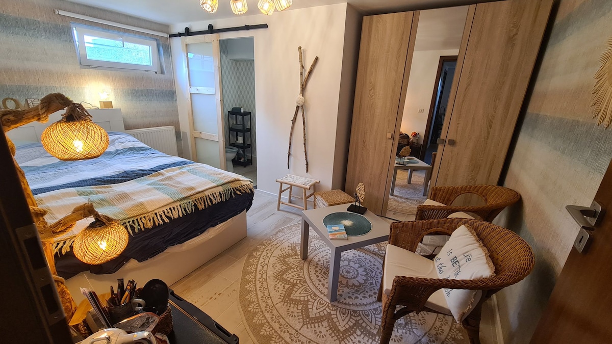 Munie d’une boîte à clés, nous proposons une entrée 💯% autonome et sans contact. Nous vous invitons dans le cocon qui se trouve au Rez de chaussé de notre maison. Une pièce (avec kitchenette, coin repas, canapé convertible, tv), une chambre avec salle d’ eau, un wc séparé. A l’ extérieur une terrasse privative de 35 m2 avec une vue sur les trois châteaux à couper le souffle!