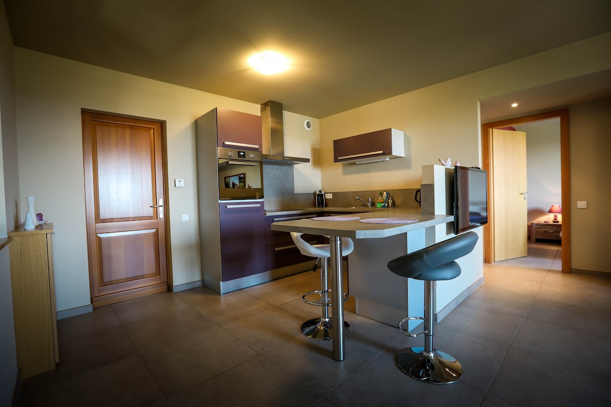 Passez votre séjour dans un environnement chaleureux et accueillant dans lequel il fait bon prendre son temps. Ce gîte de 50m2 situé au rez-de-chaussée d'une ancienne ferme du début du siècle dernier, récemment rénovée, est composé d'un séjour donnant sur une cuisine ouverte équipée de tout le nécessaire, d'une salle de bain avec douche et WC séparés, et d'une chambre avec lit double. Le salon est équipé d'un canapé convertible. Une petite terrasse exposée plein sud est à disposition.