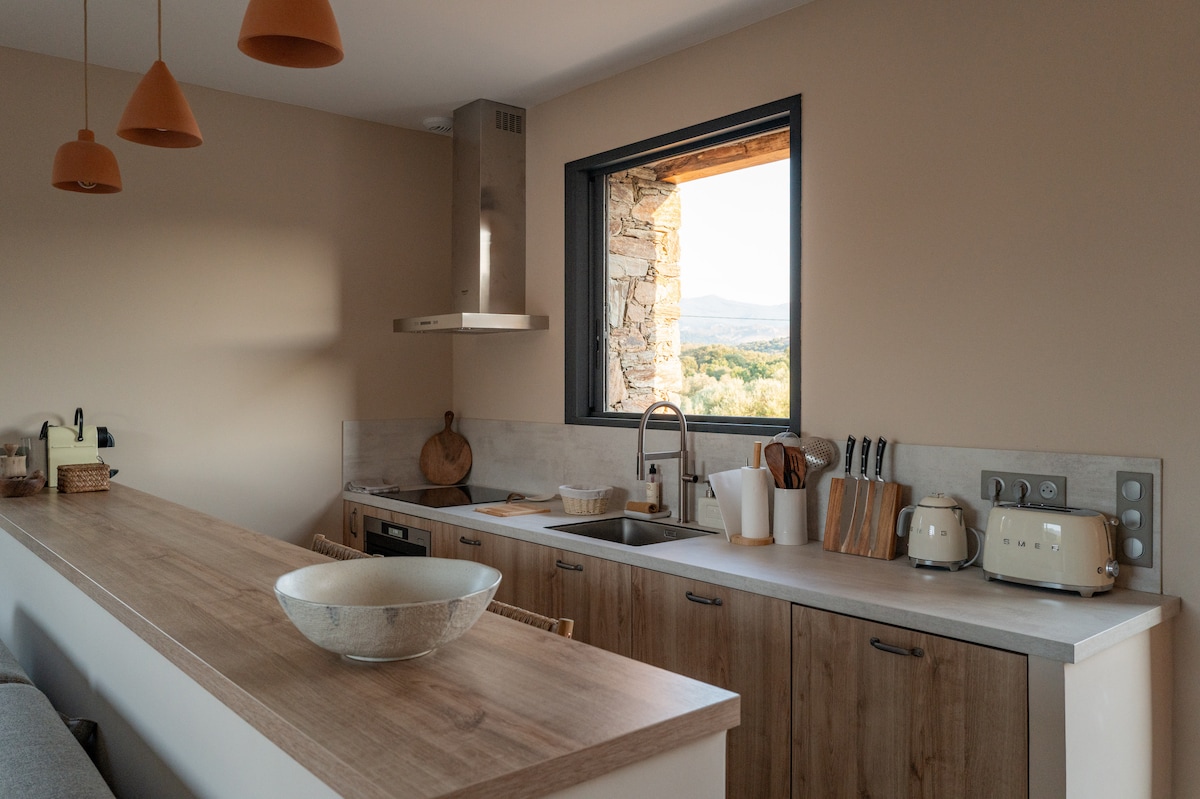 Welcome to La Bergerie, an eco-lodge nestled in the heart of the Corsican mountains. A peaceful retreat where nature, silence and comfort meet. The house sleeps up to 6 guests: two upstairs bedrooms and a bright living room with sofa bed. Fully equipped kitchen, modern bathroom and linen provided. Tea, coffee, chocolate, spices and olive oil await you. In cooler seasons, the wood stove warms cosy mountain evenings.