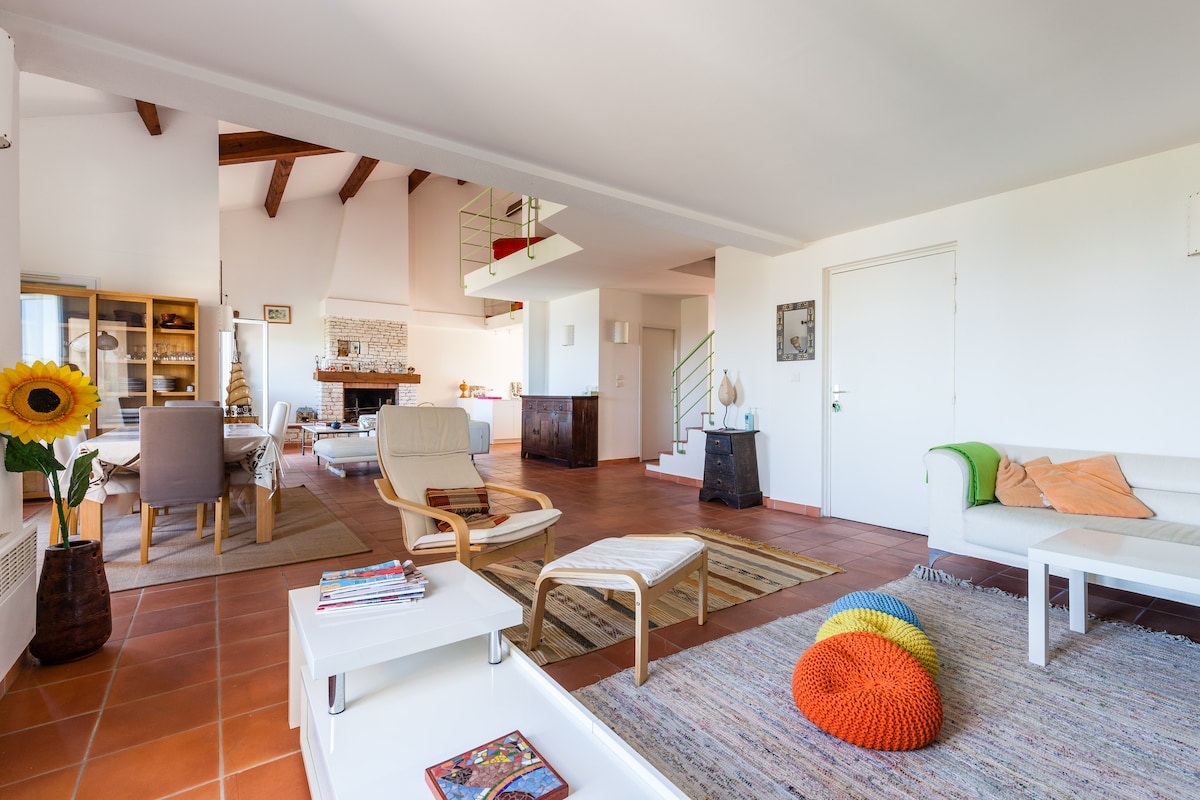 Appartement très agréable type loft en mezzanine avec poutres apparentes, cheminée en pierre, grande pièce à vivre, carrelage en terre cuite, 3 balcons vue mer et 1 côté montagne. Deux salons, salle à manger et cuisine ouverte avec ilot. 2 chambres séparées et fermées + 1 couchage supplémentaire en mezzanine sur demande. Calme, contemporain, très belles prestations. 2 parking. Plage de galets juste en face à pied ! Appartement géré directement par la propriétaire.