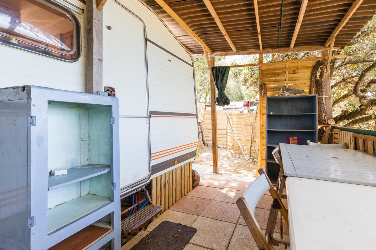 Caravan on private, quiet and wooded land, near town (15' d'Ajaccio), all shops and beautiful beaches. On the route of tourist circuits in western Corsica (Gulf of Lava, Sagone, Cargèse, Calanques de Piana, Porto, route de Calvi).