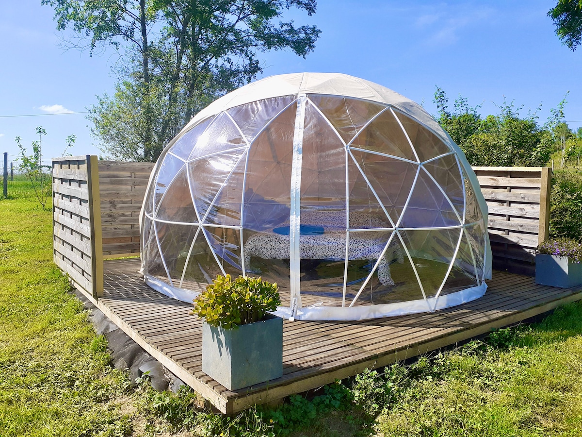 Vivez une expérience onirique en dormant à la belle étoile dans notre bulle gonflable toute transparente, nichée à l'orée dans notre bosquet. Laissez-vous captiver par la magie du ciel étoilé et laissez vos rêves s'envoler au rythme des constellations, pour une nuit empreinte de beauté et de sérénité. Cette expérience unique vous offre un séjour inoubliable au cœur de la nature, à côté de notre ferme et nos animaux. Notre bulle spacieuse de 5,5 mètres de diamètre et 23m² de surface avec son spa.