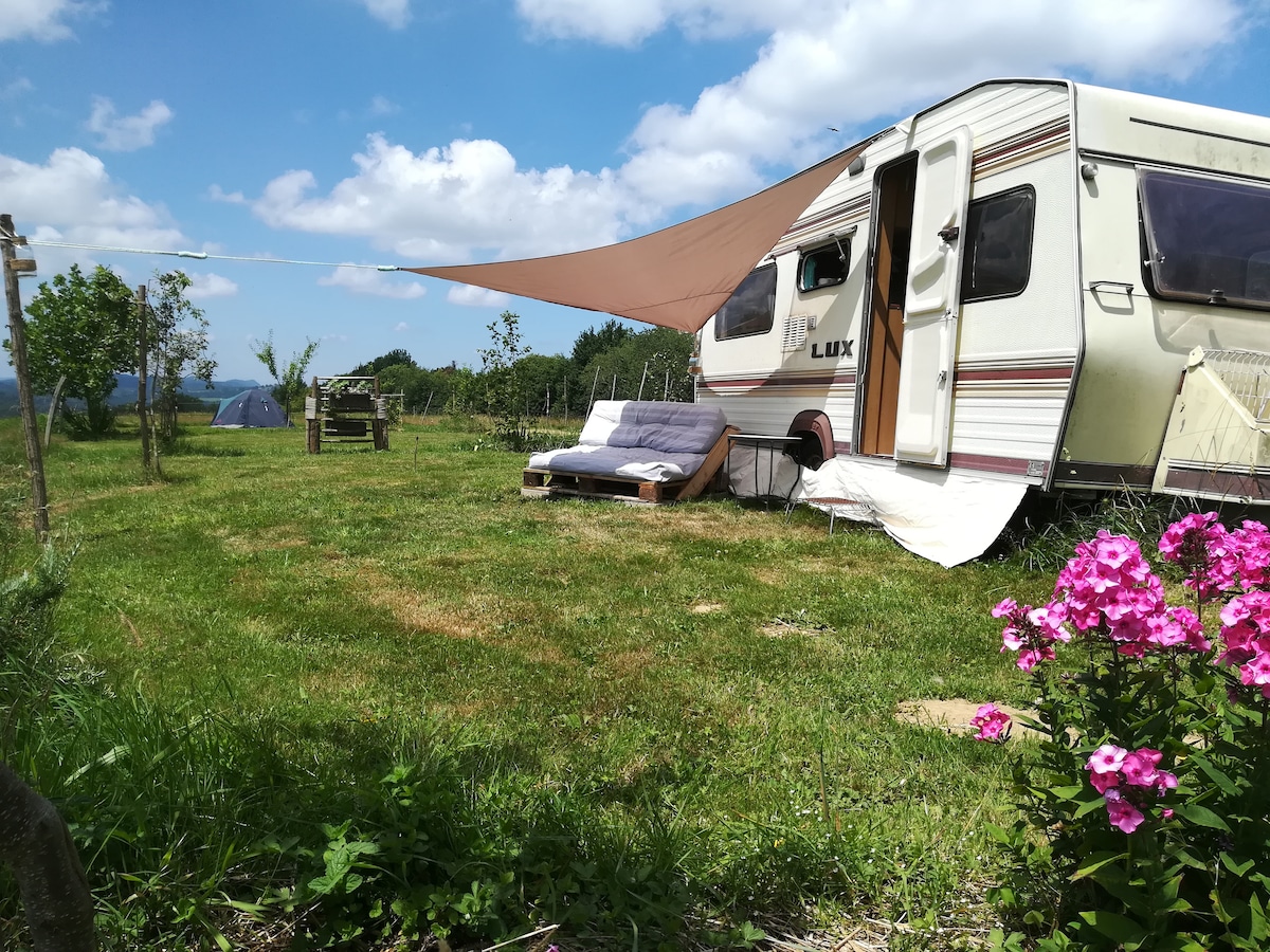 Nous vous mettons a disposition notre caravane (pour une chambre en toute intimité). Une vue à 300° sur la chaîne des Pyrénées à 500 m d'altitude vous attend. Les chemins de randonnée, lac de baignade, restaurants sont à proximité et 45 mins de la plus proche station de ski !
