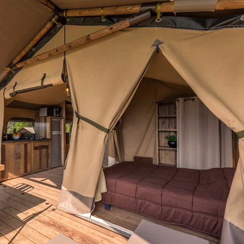 Expérience outdoor unique en France ! La vie en plein air avec le confort d'une chambre hôtelière de luxe vue sur le lac : une tente de 27 m² avec 1 lit hôtelier 200 x 160, 2 petits lits pour les enfants, grande terrasse en bois avec cuisine outdoor, salle de bain avec WC, lavabo et douche dans une cabane en bois. Et cerise sur le gateau : baignoire vintage extérieure pour prendre un bain au milieu de la nature. Et en plus sur le domaine : piscine, kayak, paddle, massages,...