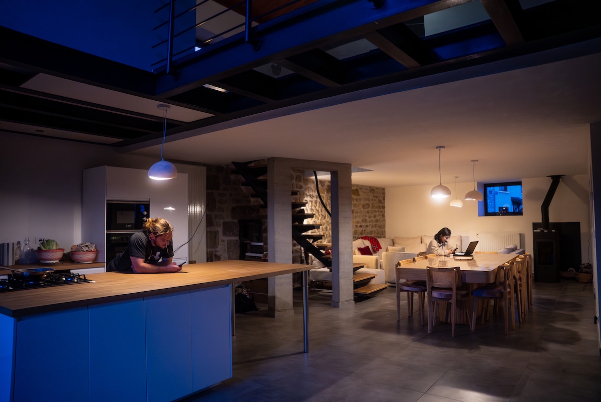 145 m2 de silence total en pleine nature rénovés tout récemment Grandes pièces de vie, deux suites parentales queen et king size, salle de détente, jardin avec plusieurs terrasses Déco mixant authentique, contemporain et quelques touches artistiques A partager en famille, entre amis, en amoureux Randos pédestre vélo départ gîte A 4 kms d'un plan d'eau WiFi et télé connectée si besoin de se relier au monde 😉 Ateliers couture bohème face aux volcans en option dans une magnifique structure voisine