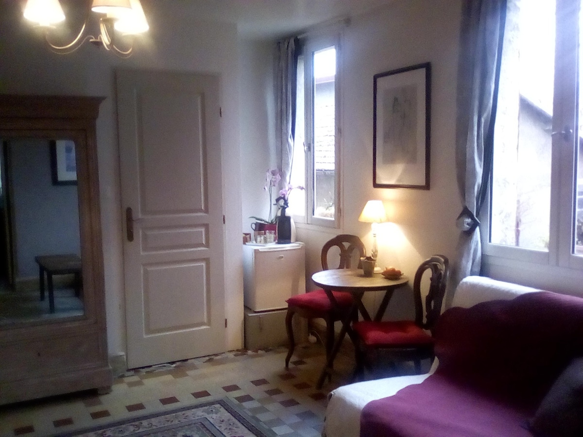 Charmant studio de 27m2 refait à neuf avec cuisine équipée, salle de douche et toilettes séparées. Table à manger avec 2 chaises et espace bureau. Ecran plat. Grand lit double 160x200. Linge de lit fourni sur demande. Parking gratuit.