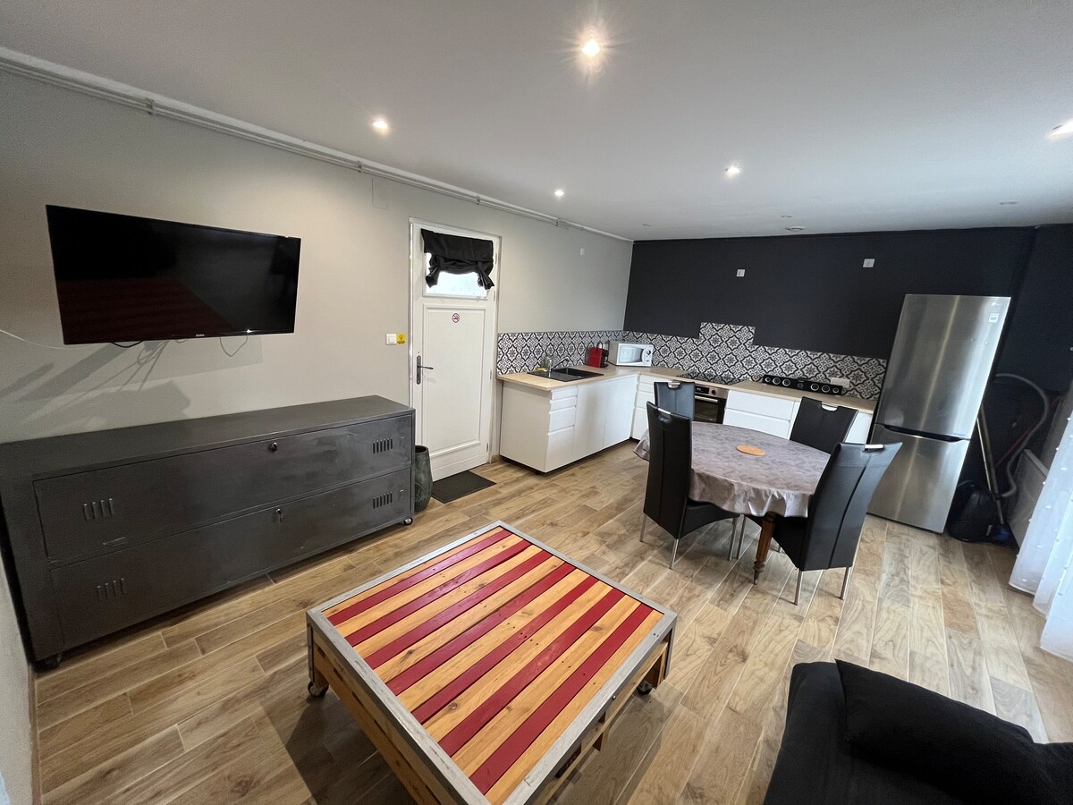 Duplex refait à neuf en mai 2022. Un véritable havre de paix. Luminosité, tranquillité… Cuisine équipée : four, Tassimo, bouilloire, frigo, grille pain, vaisselle, micro-ondes, télé connectée, coin repas et coin repos. A l’étage : lit 2 places, télé connectée, douche et toilettes. Fibre, Wifi, terrasse.