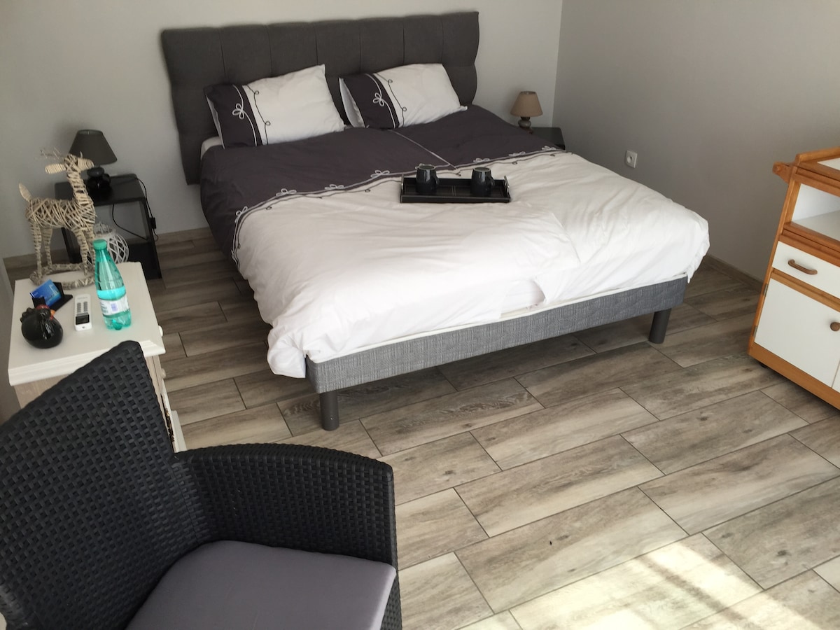 Amusez-vous avec toute la famille dans ce logement chic à 10 minutes de Nigloland en voiture et proche des grands lacs. annexe indépendant de 90 mètres carrés comprenant une cuisine ouverte avec une salle de bain moderne une chambre parentale au niveau de la mezzanine une grande chambre enfants avec un lit double et deux lit simple grande cours partager et fermé