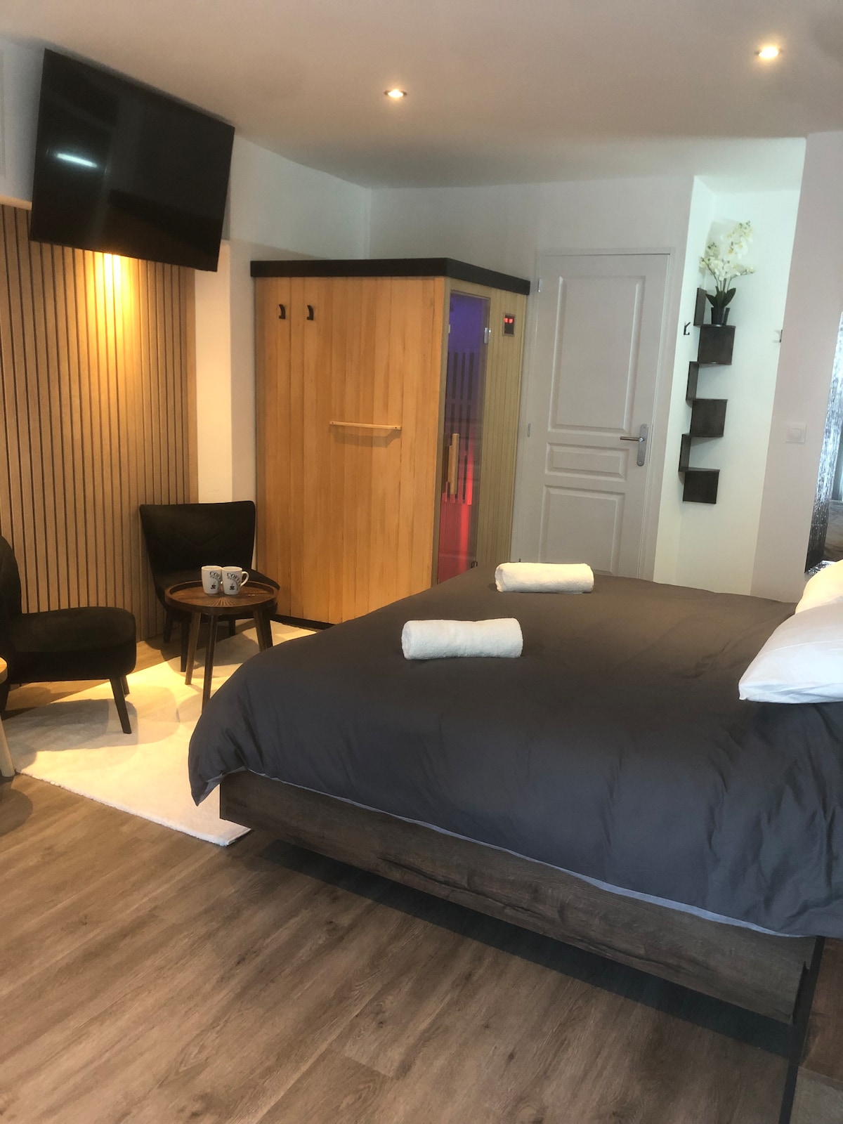 -Situé en hyper centre "En Apparte"est un meublé de tourisme classé 3 étoiles avec Sauna Infrarouge, Lit King Size et Douche hydromassante. -Sauna (Chromotherapie, Bluethooth, USB,Radio) - Lit King Size avec matelas Hybrid "EMMA" . USB, USB/c , LED intégrés - Espace de travail/Repas avec table amovible. -Espace Petit-déj/Cuisine Frigo, Four/Micro-onde , cafetière "L'or", Bouilloire, plaque -Smart TV connectée -Film sans tain aux fenêtres -Logement non fumeur