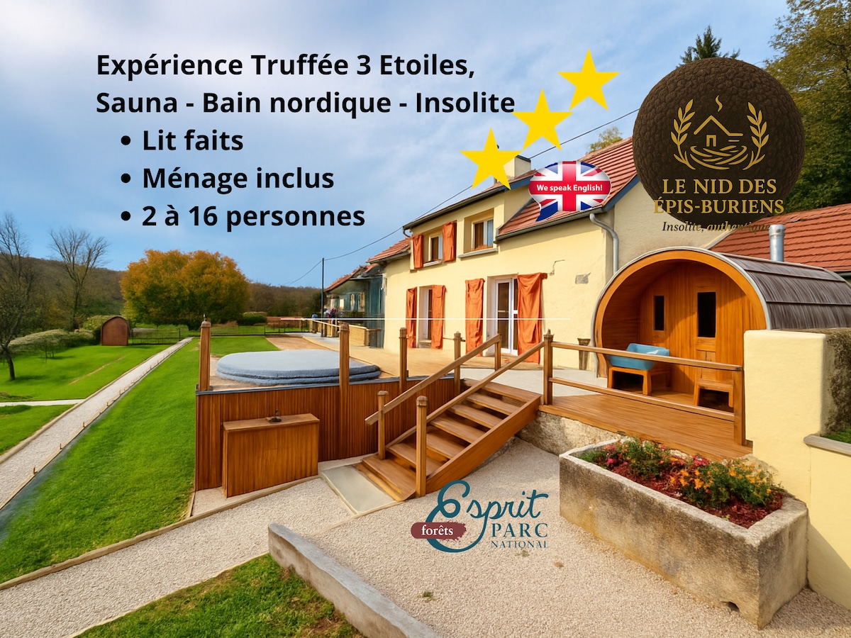 D'une capacité maximum de 16 couchages, super équipé pour vous sentir comme chez vous, notre gîte est idéal pour se retrouver en famille ou entre amis, entre adultes ou avec des enfants (mais pas de grosses fêtes ni de soirées). Les pièces de vie sont vraiment spacieuses et le gîte est conçu et équipé pour accueillir de grands groupes. Possibilité de prendre l'option "sauna". Gîte classé 3 étoiles. Nombreuses activités "nature" ou "culture" à proximité. Accès rapide par la Nationale 4 à 13 km.