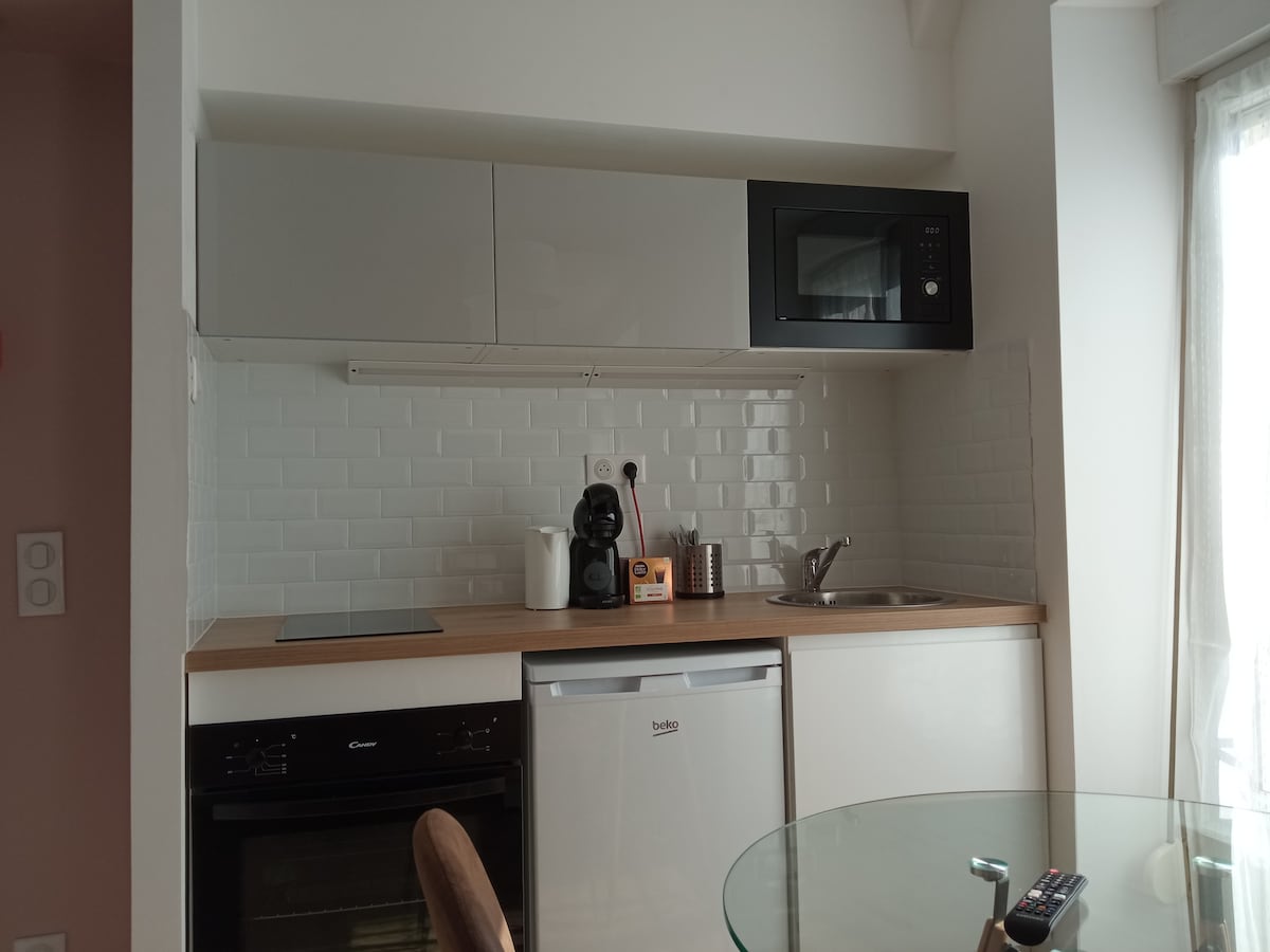Détendez-vous dans ce logement calme et élégant. Cet appartement est entièrement équipé : - espace détente : profitez de deux fauteuils relaxants parfait pour vous reposer après une journée bien remplie + 1 lit 1 place - une belle chambre avec un lit double 160cm pour des nuits paisibles (couette et oreiller : dodo) - une cuisine équipée : tout le nécessaire est à votre disposition pour cuisiner comme à la maison : ustensiles, poêles, casseroles, bouilloire, grille pain