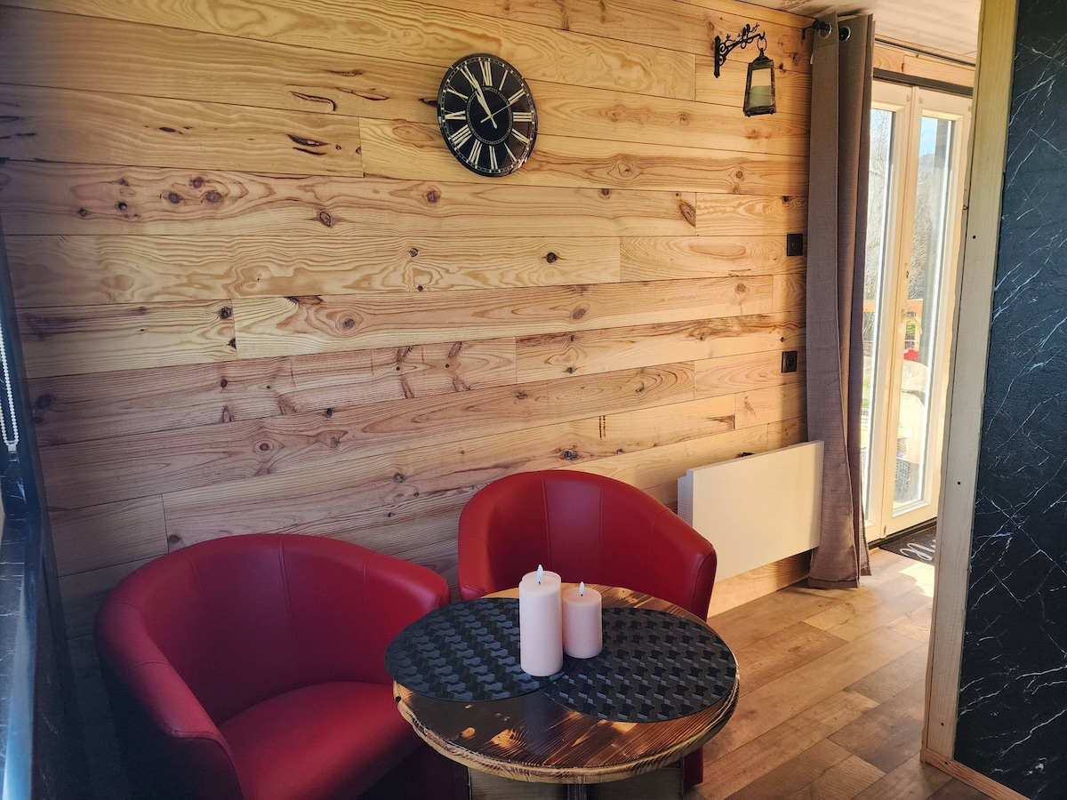Découvrez la tranquillité de la campagne dans notre Chalet décoré au couleur de la nature. Un poêle à bois est installé afin de rendre atypique les soirées un peu fraîches du printemps et de l'automne. Le système d'eau et directement connecté à l'eau de pluie, qui est ensuite filtrée et traitée pour l'utilisation des appareils du chalet (Douche,WC,cuisine, chauffe eau...). Deux bouteilles d'eau vous seront fournies à votre arrivée (prévoir de l'eau en bouteille pour la consommation personnelle).