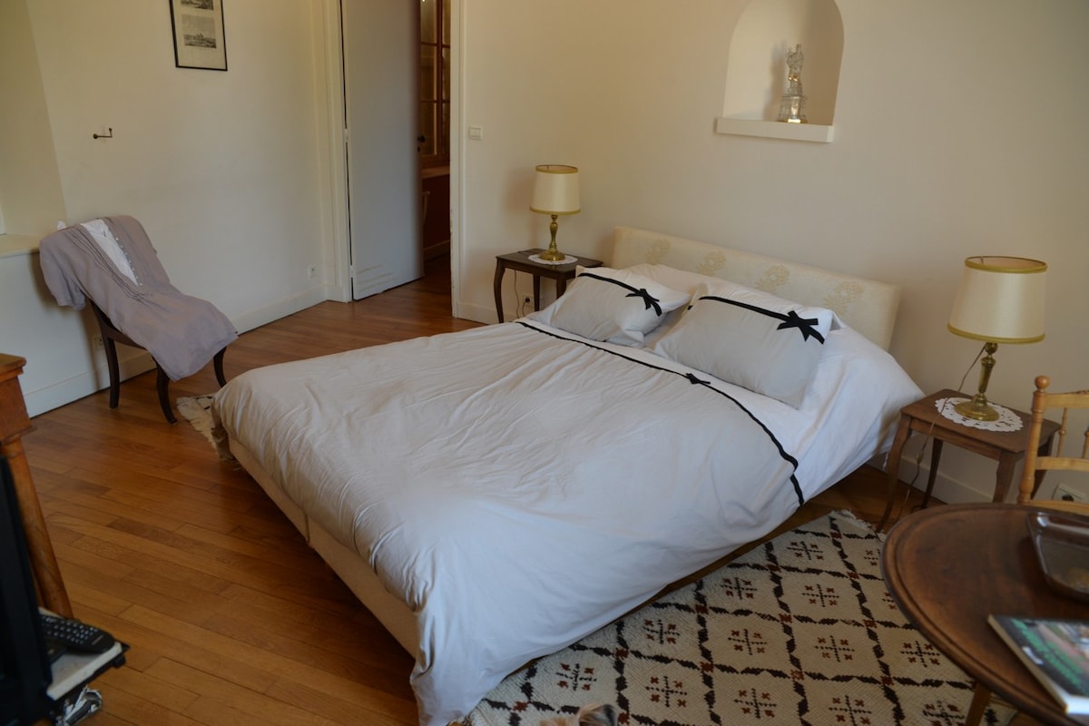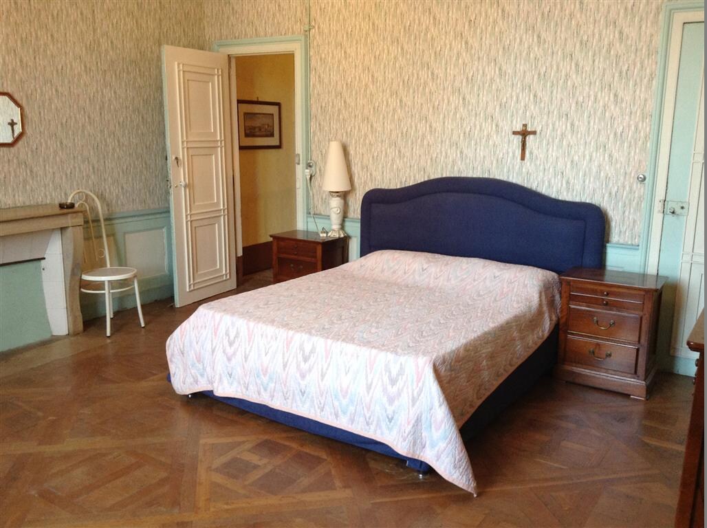 Profitez d'une grande chambre dans le château de 60 m2 avec cheminée et tommettes du XIVème siècle Salle de bain de style moderne et wc privés. Chambre au deuxième étage du château, avec lit double de 160cm. Petit déjeuner compris dans le prix de la chambre.