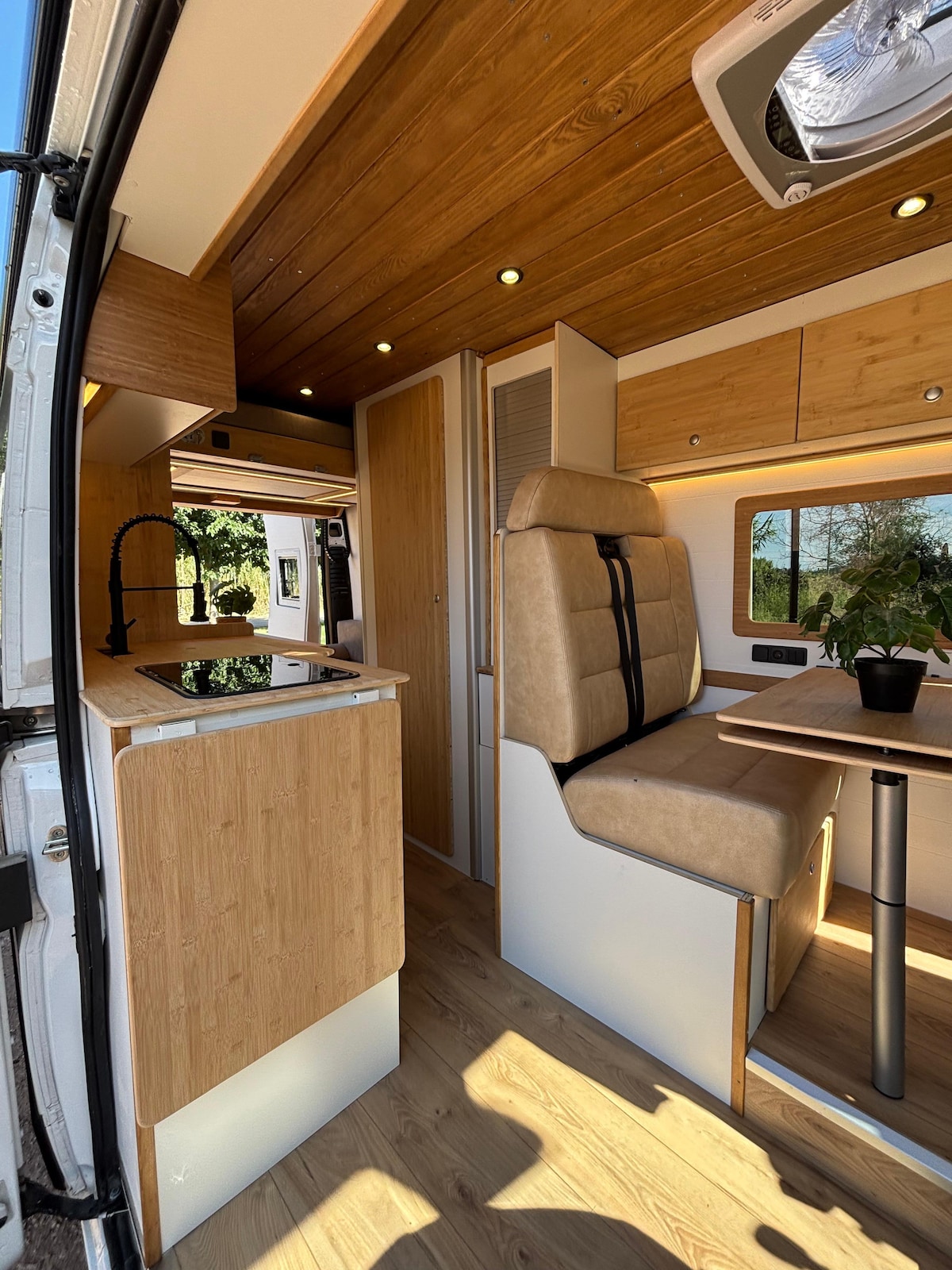 Ce van unique allie confort, autonomie et ambiance chaleureuse. Son intérieur en bois, ses 4 couchages, sa douche, ses toilettes, sa cuisine équipée et son chauffage permettent de voyager en toute liberté, été comme hiver. Grâce à la batterie lithium, au panneau solaire et aux rangements bien pensés, vous êtes totalement autonome. Un cocon mobile pour vivre la route autrement, avec simplicité et confort.