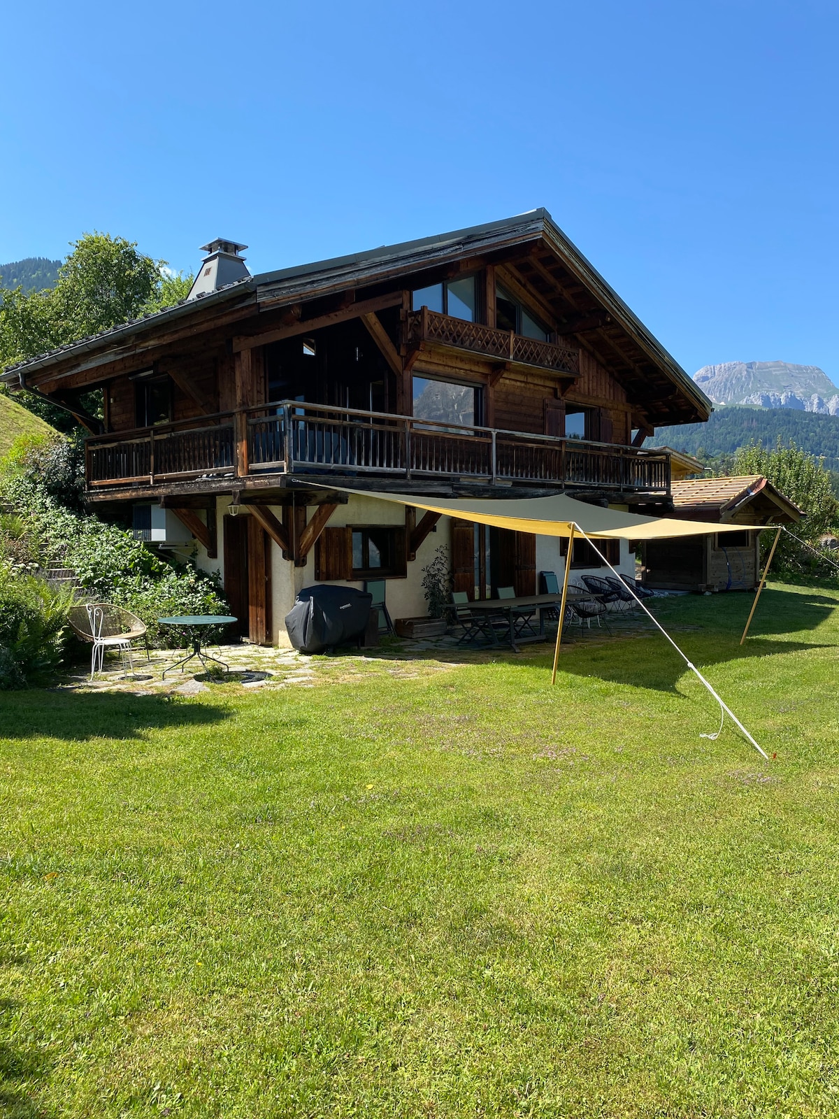 Add logs to a fireplace with a massive stone hearth and recline on a rustic wooden sofa. Gaze through picture windows at the alpine forest surrounding an authentic chalet. Return from the slopes and unwind in a luxury sauna in a cabin-chic bathroom. Une chambre de 25m2 avec lit double, rangements, armoire authentique. Un salon chaleureux et spacieux avec double baies vitrées donnant sur le Mt Blanc et cheminée. Et un sofa banquette convertible en 2 lits individuels. Cuisine pratique et toute équipée. Une salle de bain en granit avec douche et sauna 3 personnes. Une terrasse devant forêt et ruisseau ( avec fréquente visite des biches - voir photos ), avec fontaine et vue imprenable sur le massif du Mt Blanc. The chalet is an individual construction fully available and reserved for the guests. So are the terrace and the surroundings ( a small river, a private bridge and access to the forest ). A disposition pour toute question. Dans le hameau de Coupeau : Chalet authentique dans la forêt au-dessus des Houches avec vue exceptionnelle sur le massif du Mont Blanc. En Bord de petit torrent avec des biches A 5 min en voiture des Houches, à 10 min de Chamonix, à 1h de Genève. Easy access by road to the chalet. 2 kms from Les Houches and 10 kms from Chamonix. Parking just behind the chalet A fully renovated old chalet. With all modern comfort ( inc Sauna for 3 ) and top decoration. A unique view on the MontBlanc chain. The chalet is in the hamlet of Coupeau, in the forest above Les Houches, with exceptional views of Mont Blanc. It's a 5-minute drive to Les Houches, 10 minutes to Chamonix, and an hour to Geneva.