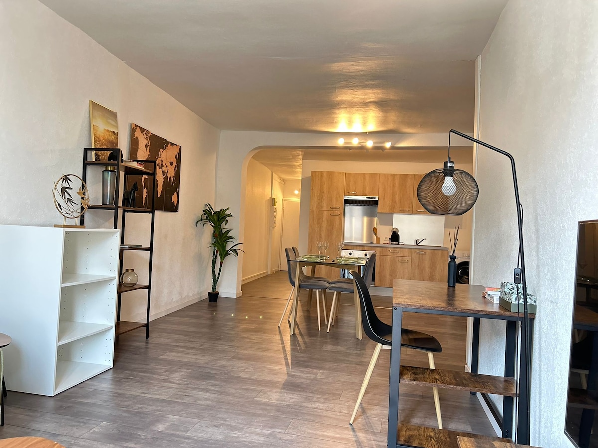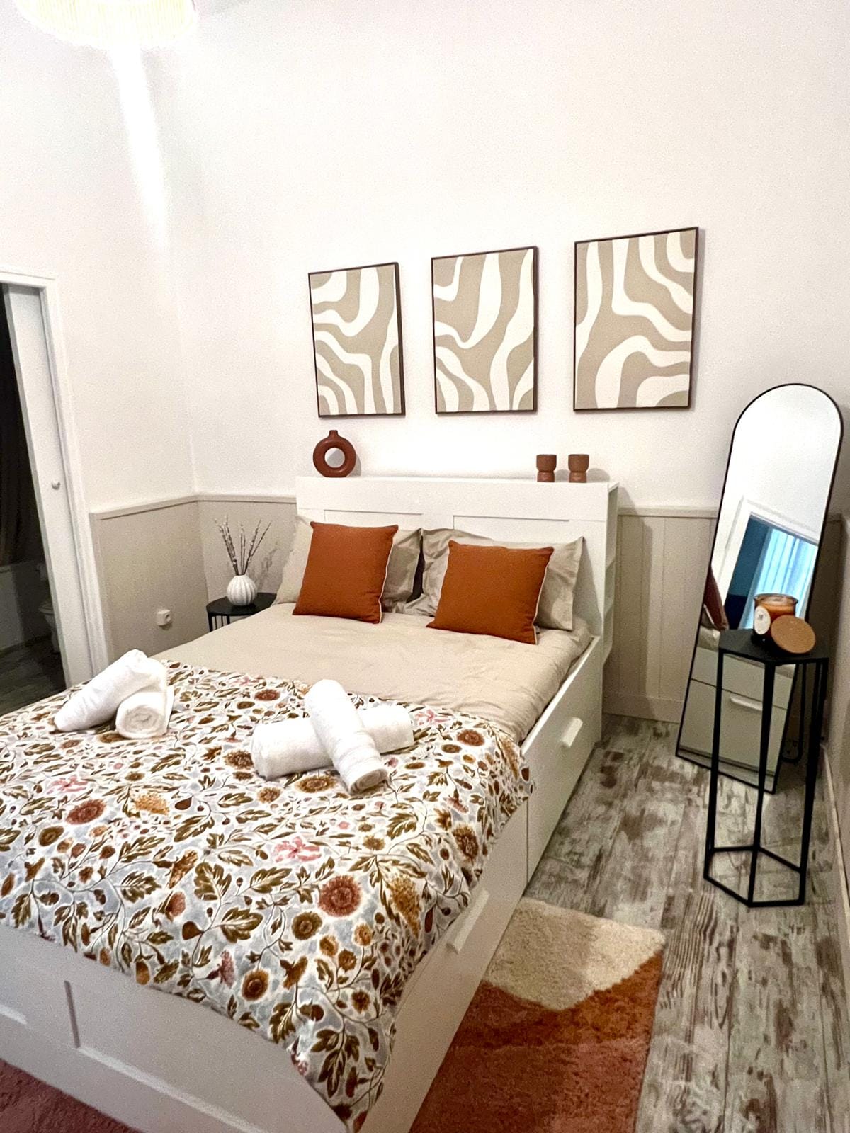 Profitez d'un logement central tout confort avec WIFI. Cuisine équipée comme à la maison, d’une machine à café Barista et possibilité de précommander votre petit déjeuner ou déjeuner chez Bloom Kitchen pour l’arrivée ou durant votre séjour avec 10% de remise sur les tarifs appliqués. Salon cosy et moderne avec fibre, rétro projecteur, livres et enceintes à disposition dans une ambiance paisible. La chambre dispose de rangements à disposition et d’un lit 160cm avec sur-matelas