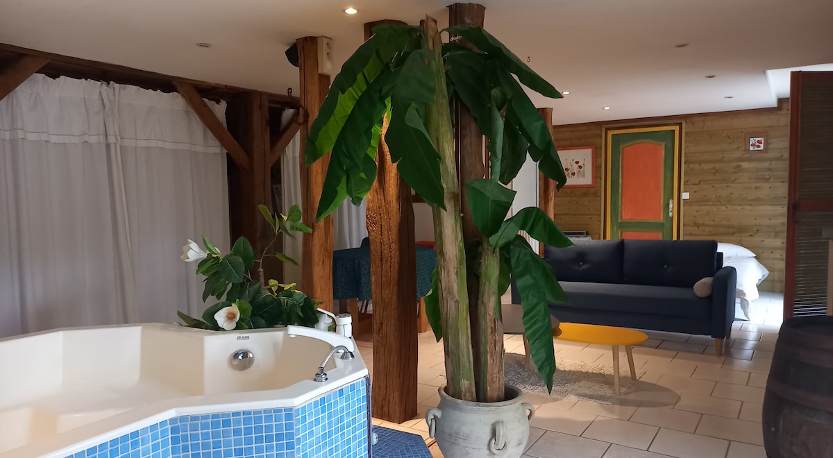 La Suite “AUX BULLES 2” allie esthétisme et romantisme, offrant un cadre de vie élégant et unique. L’architecte a mis un soin particulier dans les détails, en intégrant des matériaux de qualité et des équipements modernes. Vous pourrez vous relaxer et partager des moments privilégiés dans la baignoire balnéo double, idéale pour se détendre et se retrouver. Préparez-vous à vivre un moment inoubliable !