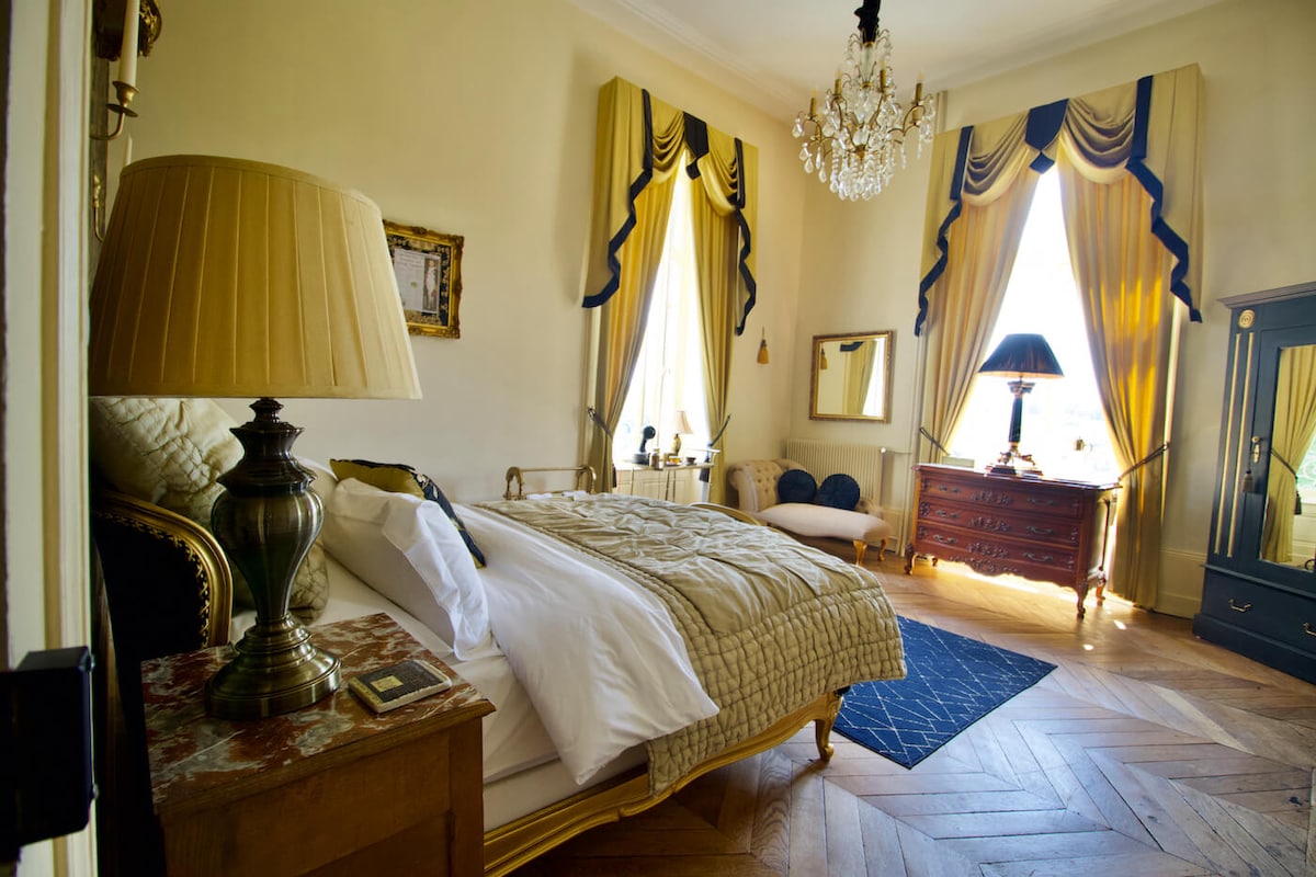 This stylish and unique bedroom sets the stage for a memorable trip at Château les Villettes, set in the heart of Limoges countryside. This large king room has been tastefully refurbished with a feature wall in the imperial colours of gold and black. The dual aspect windows offer views over the rolling countryside. It has an accompanying ensuite shower room next door, with a large fully tiled shower and traditional washstand.