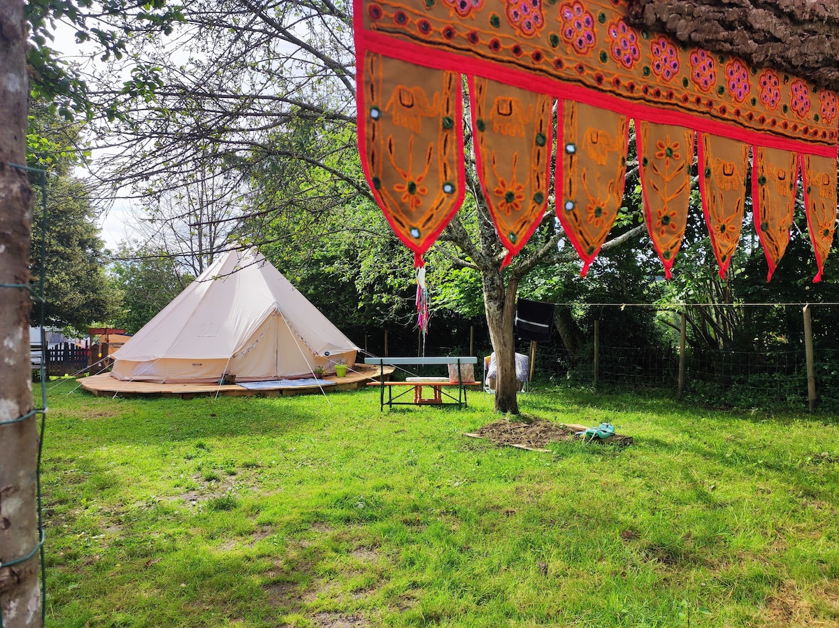 Luxury glamping Lotus Belle tent in the serene Corrézien countryside, ideal for couples or small families. On our small six-pitch campsite, the tent offers a calm, relaxing space with a comfortable bed, linens, and a private kitchen area. Enjoy our pool, on-site bar, and delicious pizzas, or wake to birdsong and explore nearby trails and villages. Unwind in the peaceful, private natural setting for a unique boutique glamping experience with full comfort.