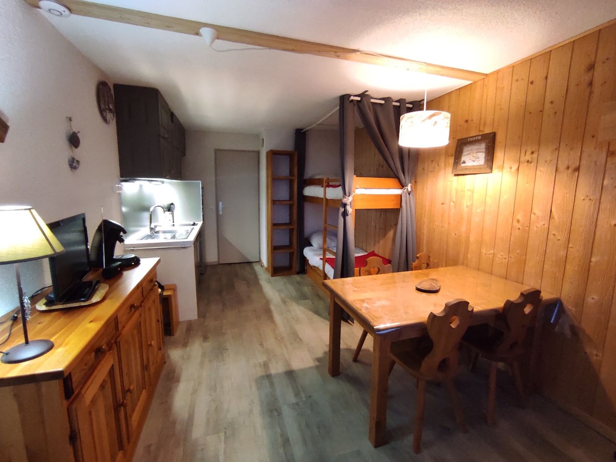 tudio cabin all comfort 4 people low station Les Saisies. Large living room renovated with kitchen, ceramic hob, sofa bed bultex, balcony facing south. 2 bunk beds in the entrance (new mattresses), a bathroom with bathtub. Beautiful view of the Beaufortain massif. Bed sheets and bath sheets provided. Come and enjoy a moment of calm and relaxation in nature! Access to various outdoor sports: mountain biking or VAE, hiking, trail, swimming pool, tree climbing...