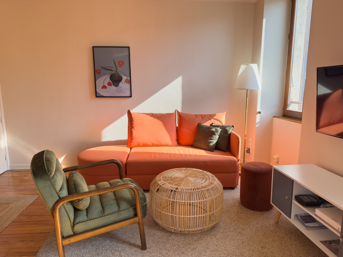 Bienvenue à LA VILLA JAZZ Bel appartement de caractère, refait à neuf, chaleureux, spacieux et lumineux avec 6 couchages et disposant d’un parking privatif fermé. Idéalement situé pour une escapade à deux et découvrir les secrets de Vienne, un séjour en famille ou un voyage d'affaires Cet appartement de standing, de 70 m² carrés, où il fait bon vivre, est situé en rive droite du Rhône le long de la Viarhôna au premier étage d'une bâtisse de caractère sur la commune de Sainte Colombe (69) .
