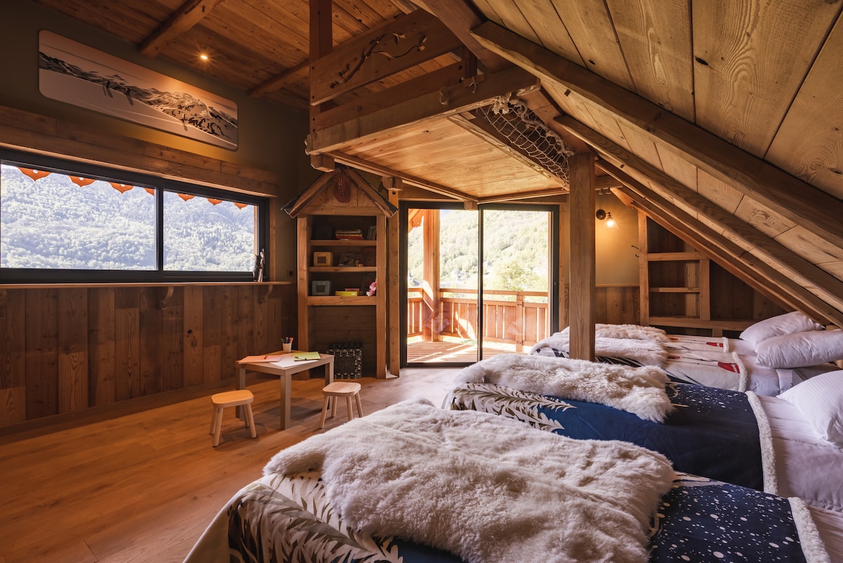 Venez profiter d'une expérience ressourçante au sein de la Grange du Père Émile, nouveau chalet de village, dernière née des Granges Deth Pouey. Vue absolument panoramique de toutes les pièces et du jardin clos, ainsi que du sauna et de la douche extérieure. Dépendance sécurisée pour les vélos et skis. Clim dans toutes les pièces. 2 chambres avec chacune sa sdb. Logement spacieux pour 4 personnes. Lit de camp d'aventurier pour un enfant (5p). Chargeur V.Elec. Prestations de très belle qualité.