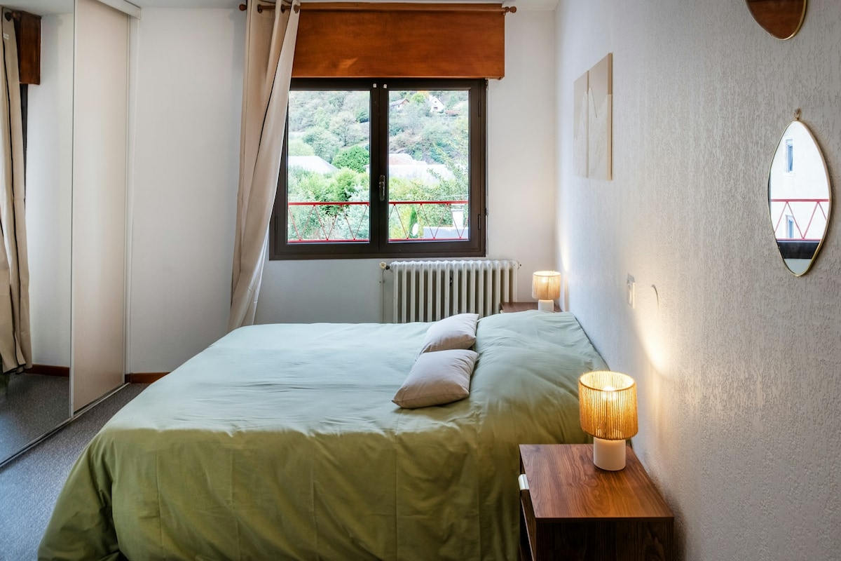 This air-conditioned, soundproofed accommodation boasts a view of the Pyrenees and is equipped with flat-screen TV and free Wi-Fi internet access. It is less than 10 minutes from the Notre-Dame de Lourdes shrine and the Grotto . It is close to shops, restaurants and the town centre on foot, the tourist office and the bus station and sncf . We have a private pay car park for cars and motorbikes.