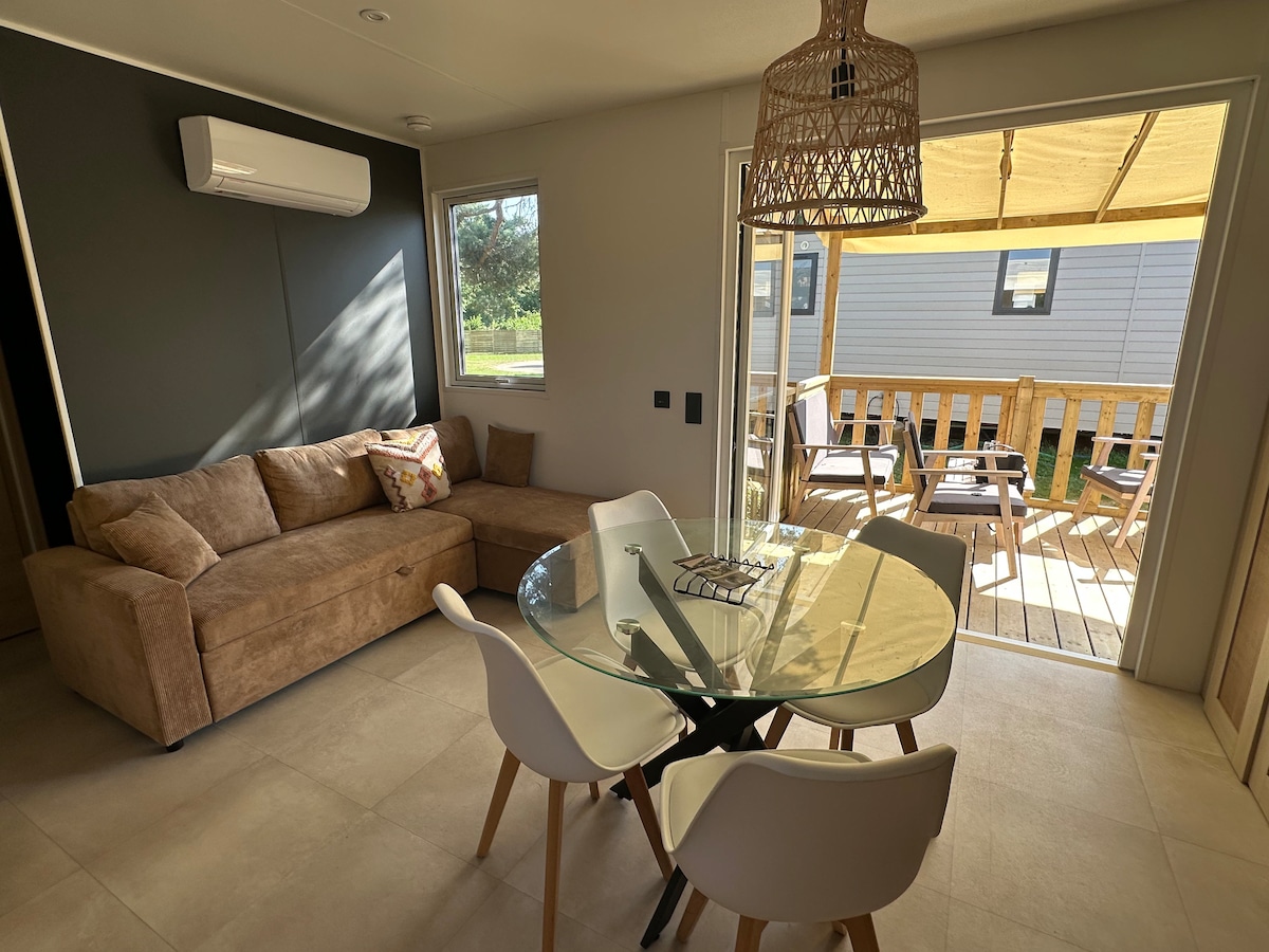 Ce mobil home 6 personnes offre une superbe vue mer. 🏝️ Il possède 3 chambres dont une chambre parentale donnant accès directement à la salle de bain. Séjour spacieux, cuisine équipée, télévision, four, micro ondes et climatisation réversible. Toilette indépendant. Une grande terrasse, une place de stationnement. L'accès à la plage se fait directement à la sortie du camping. Un seul chien est accepté par location ☺️ N'hésitez pas à me contacter pour plus d'informations. Amandine